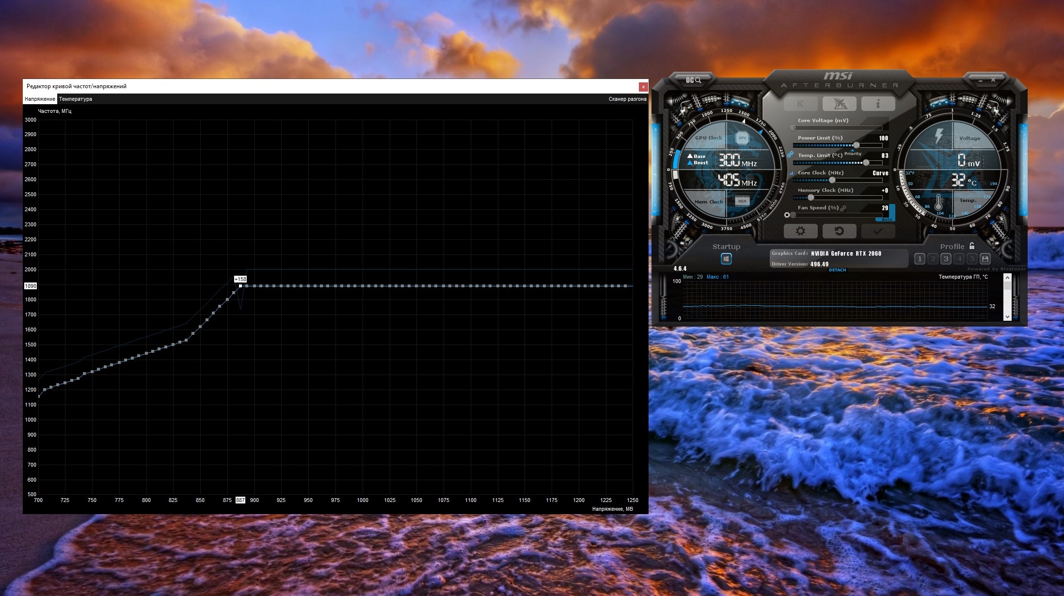 Решил попробовать снизить напряжение на Palit RTX 2060 Dual 6Гб. Ей 2,5 года, используется исключительно для игр. До этого ни разу этим не занимался. Настроил кривую по инструкции в шапке. Вот только результат меня смущает: в стоке, в закрытом корпусе при напряжении 1,05В греется до 65, при напряжении 0,887В греется до 62 но уже при открытом корпусе. Это нормально или все же что-то неправильно настроил? Я рассчитывал получить более большую разницу в температуре.