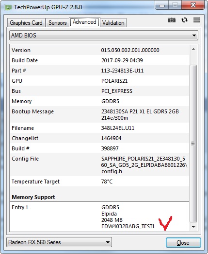 У меня такая же.Тоже немного расстроился из-за неполно написанной инфы.Хотя тайминги прописаны до 1750.Но я разогнал до 1850 память(Ельпида) при 1300 частоте проца.Выше-вылетал в 3d-mark(Сначала сетка из точек)появлялась.И крашился драйвер в Fure-Mark.Но зато частота проца 1226,выше чем на других rx560-2gb.Вроде только на Асус 1300 1750. Меня ещё немного напрягает версия биоса.Без даты выпуска(в GPU-Z) и со словом TEST
