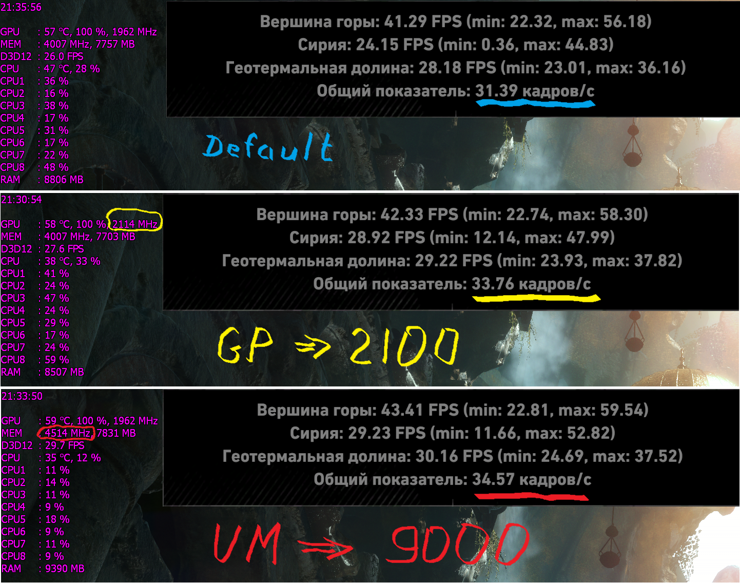 Чтобы внести немного ясности в наши яростные споры по поводу того какая карта лучше бустирует из коробки, какая лучше разгоняется руками, и вообще какая лучше. Решил посмотреть насколько получим прирост FPS при разгоне видеоядра и видеопамяти на примере игры Rise of the Tomb Raider. Сделал 3 замера на встроенном тесте производительности игры при ультра-настройках и 2К-разрешении: 1. Замер на дефолтных частотах. 2. Разгон видеоядра до 2115 МГц. 3. Разгон видеопамяти до 9000 МГц Процессор Core i7 6700К - 4500МГц. RAM 16Gb 3200МГц Video - EVGA 1070 FTW Monitor - 2K (2560 x 1440)