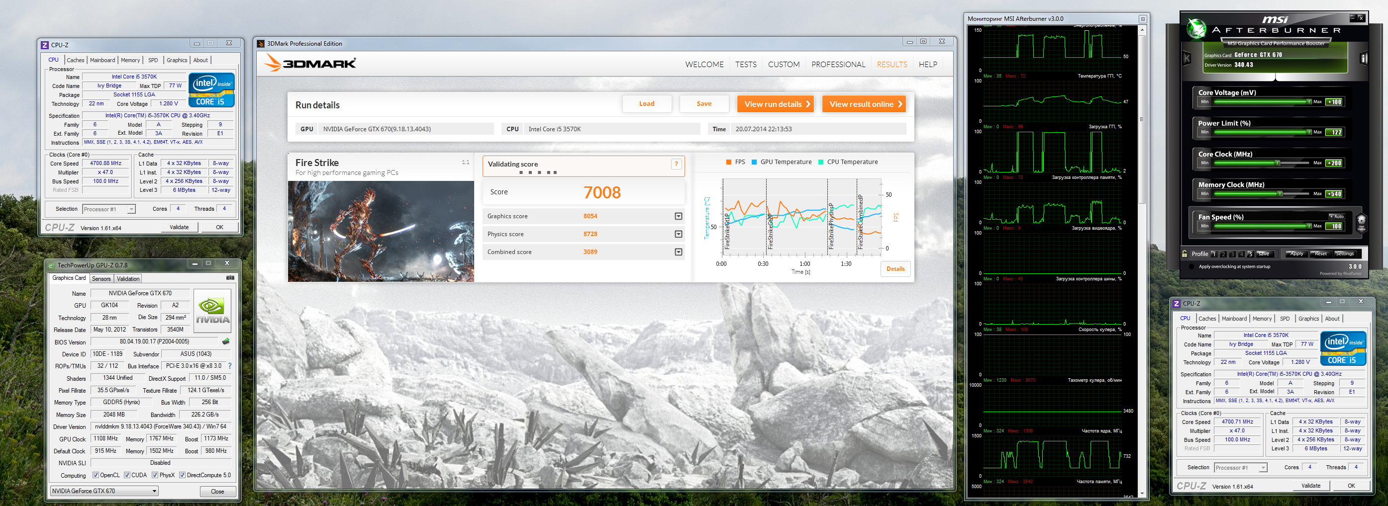 7008, если быть точным CPU 3570K @ 4700 GPU GTX 670 @ 1108/1767 geforce 340.43