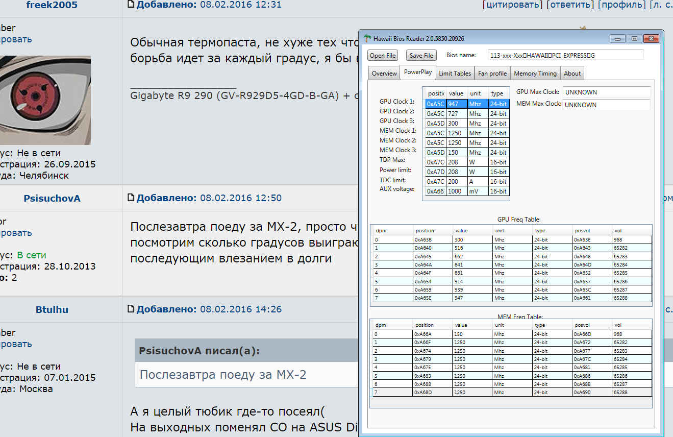 dr0zdandre У тебя новее Hawaii Bios Reader, и таблицы нужные есть! Ты видимо хотел что-то в правой большой исправлять, а надо GPU Freq tabe, MEM Freq table и Limit Tables