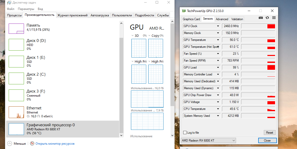 Ну чудес не бывает. Загрузка есть, но загрузки нет. Скинь скрин хоть открытых диспетчера и HWinfo. И единственную проблему с загрузкой карты, связанную с дровами, ловил еще на rx480, когда после выхода и киберпанк 2077, висела загрузка то-ли памяти, то ли ГП (не помню уже, давно было и вроде как в процессах видно было). Связано было с процессом AMDRSServ.exe, который лежит в Program Files\AMD\CNext\CNext. Отвечает он вроде бы за что-то связанное с видеозахватом или чего-то такое. Я его тогда удалял и на этом все проблемы заканчивались (если в диспетчере прибить, тоже загрузка падала сразу). Но на 6800ХТ все в стоке и проблем нет.