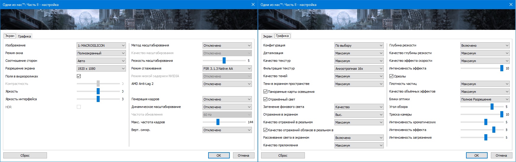 inostranec Ориентируйся на уровень 4060 за минусом 5-10 кадров - ну это в идеальных условиях. Я вчера поставил вот на таких настройках идёт примерно 62-65 кадров иногда просидая до 53-55 при прогрузках и загрузках локаций. Судя по тестам должно быть в районе 75 кадров, но у меня система работает в 8х режиме и старый драйвер и пока только начало игры, я в снегах тестил. И ещё вопрос в игре не отключаемое масштабирование или оно не отключается из-за старого драйвера или оно отключено? Визуально не чувствуется что включен фср.