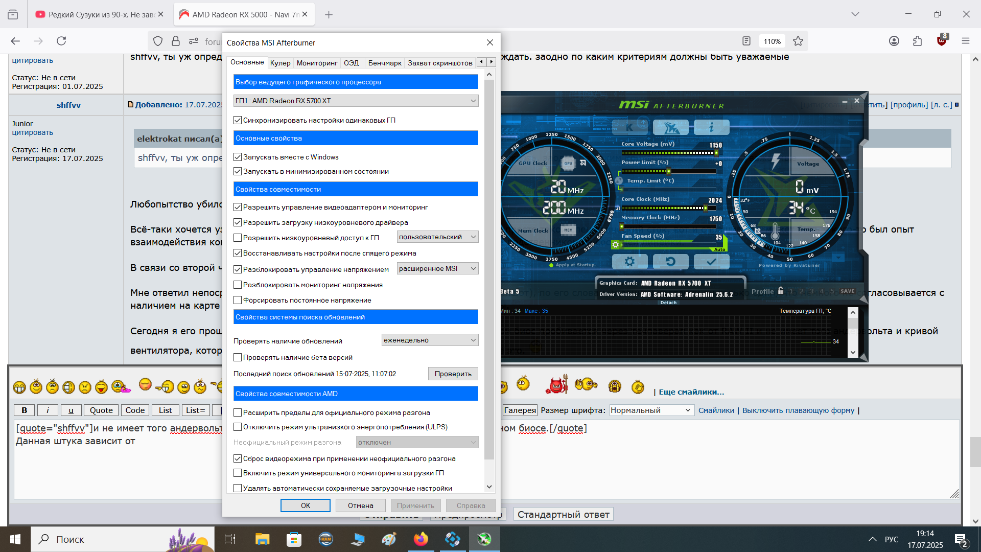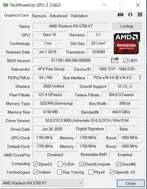Бегло пробежавшись по обзорам карты и ея всевозможным бенчмаркам на ючьюбе, а также покопавшись в темах на форумах, я удостоверился в том, что у других людей конкретно подобной проблемы не возникало - да, были жалобы на фризы и общую плохую производительность, но конкретно к моей ситуации это имело мало отношения. В результате, в моей голове сразу возникло предположение, что карта все-таки с майнинга, а значит на ней стоит модифицированный майнерский биос и его нужно прошить на сток. Уже имея подобный опыт с RX 580 и GTX 1070 Ti в прошлом, я решил, что дело плёвое - пару минут и у меня будет нормальная игровая видеокарта. Как же сильно я ошибался... Первое, что бросило на мою уверенность в успехе тень сомнения, было отсутствие родного биоса в графке загрузок на сайте XFX. Биосы там были под все 5700 и 5700 ХТ карты - THICC, RAW, Ultra. Но только не под мою Double Dissipation 2.0. "Не беда, идём на течпаверап!" - подумал я и отправился скачивать залитый кем-то другим дамп биоса. Открыв ветку с моей картой, я обнаружил главное несоответствие - версию биоса на моей видеокарте и общим пулом биосов конкретно от XFX. Мой биос был маркирован как 017.001.000.068.000000, тогда как подавляющее большинство биосов от XFX для RX 5700 XT шли как 017.001.000.049.000000. "Эврика! Биос все-таки майнерский!" - воскликнул я и отправился прошивать карточку через amdvbflash (который, как оказалось, не работает с Windows 11 24H2, для чего мне пришлось отдельно накатывать десятку, но это уже другая история), предварительно сняв с карточки дамп и сохранив его на все том же течпаверапе (на всякий случай). Первым звоночком стало то, что карта наотрез отказывалась прошиваться и мне удалось прошить ее только через 2.93 версию по какому-то ноунейм гайду с ючьюба. Сперва выдавало конфликт p/n mismatch, потом уже и ssid mismatch. Т.е. что-то карточке в биосе от казалось бы родного вендора все-таки не нравилось. В конечном итоге она все-таки сдалась, прошилась и потребовала перезагрузки. Загрузился я уже в 11. И каково же было мое удивление - ТИШАЙШАЯ доселе карта стала гудеть вентиляторами как взлетающий боинг, причем с минимальной нагрузкой в 4% в простое на рабочем столе. Решив, что дело может быть в драйвере, я снес его через DDU в безопасном режиме и накатил заново. Однако это не помогло, карта по-прежнему продолжала орать как не в себя. Кульминация: