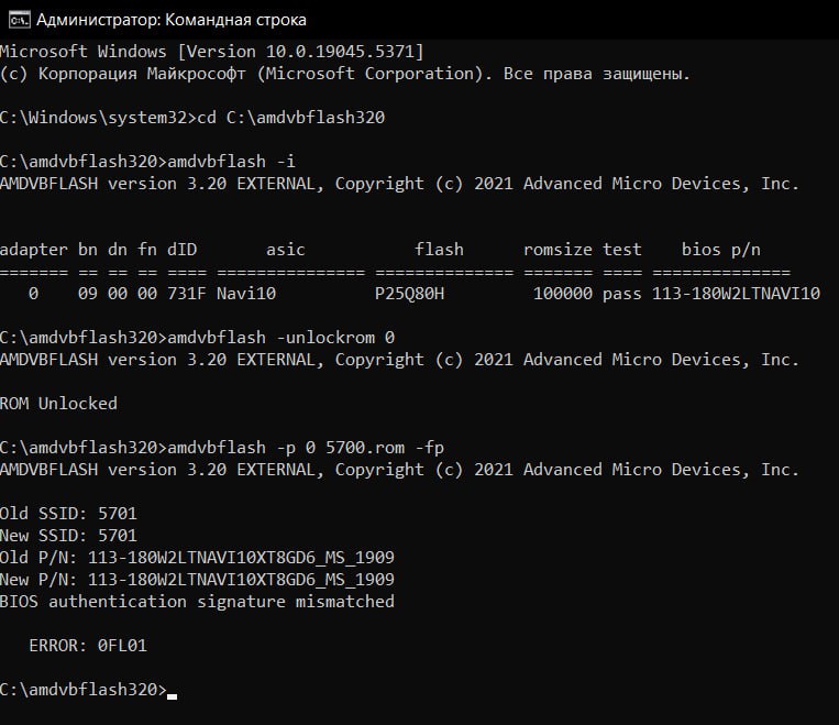Такое бывало, не понятно почему. *Это именно в контексте, если надо прошить "битый" BIOS после неудачной прошивки. В нормальной ситуации должно шить без танцев с бубном. Или надо команду прошивки изменить, здесь посмотри пост: AMD Radeon RX 5000 - Navi 7nm RDNA #18347812 Может быть надо ещё -fa -fs добавить. Под спойлером файлик из архива с прошивальщиком, весь список команд/параметров/опций, которые должна, по идее, поддерживать версия 2.93