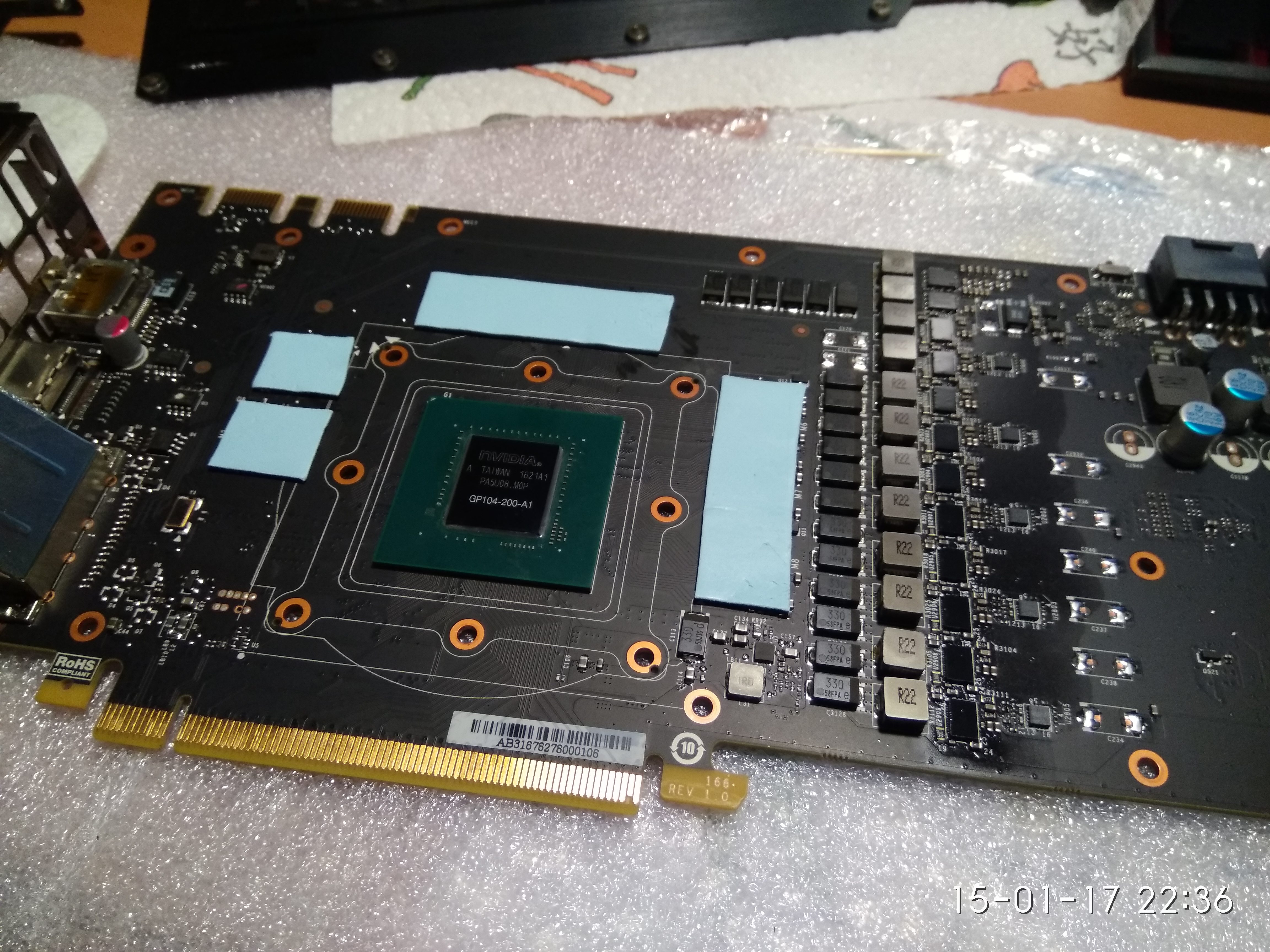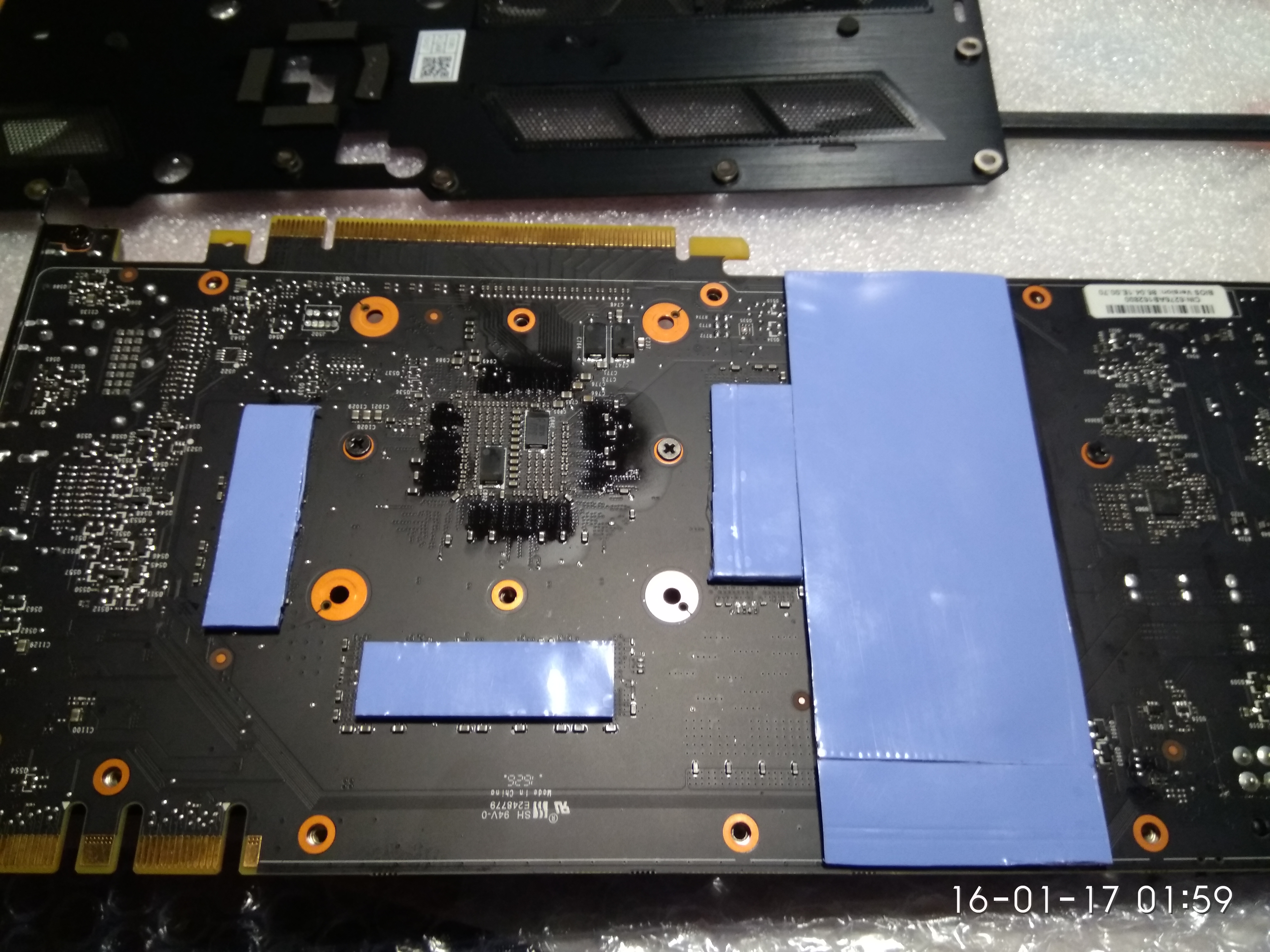 Закончил я эпопею с установлением "неофициальных" прокладок на свою EVGA 1070 FTW. Можно подвести предварительные итоги. Термопрокладки из EVGA мне еще даже не отправлены, ждать можно долго, и как я понял можно не дождаться, не на что их будет клеить. Да и нетерпячка уже пару дней мне покоя не давала и конечно же подстегивал положительный пример форумчан В наличии была термопрокладка 100х100х2мм из Али и чуть поменьше обрезок от Arctic толщиной 0.5 мм. Изначально планировал только поставить 2 ленты на зону VRM, одну на фронтальную панель, другую бекплейт. В процессе разборки выяснилось что микросхемы памяти вообще не касаются термопрокладками, а для их замены у меня ничего не было. Долго думал что можно сделать, в итоге оставил те что стояли, но на микросхемы положил в один слой по квадратику от Arctic толщиной 0.5 мм.