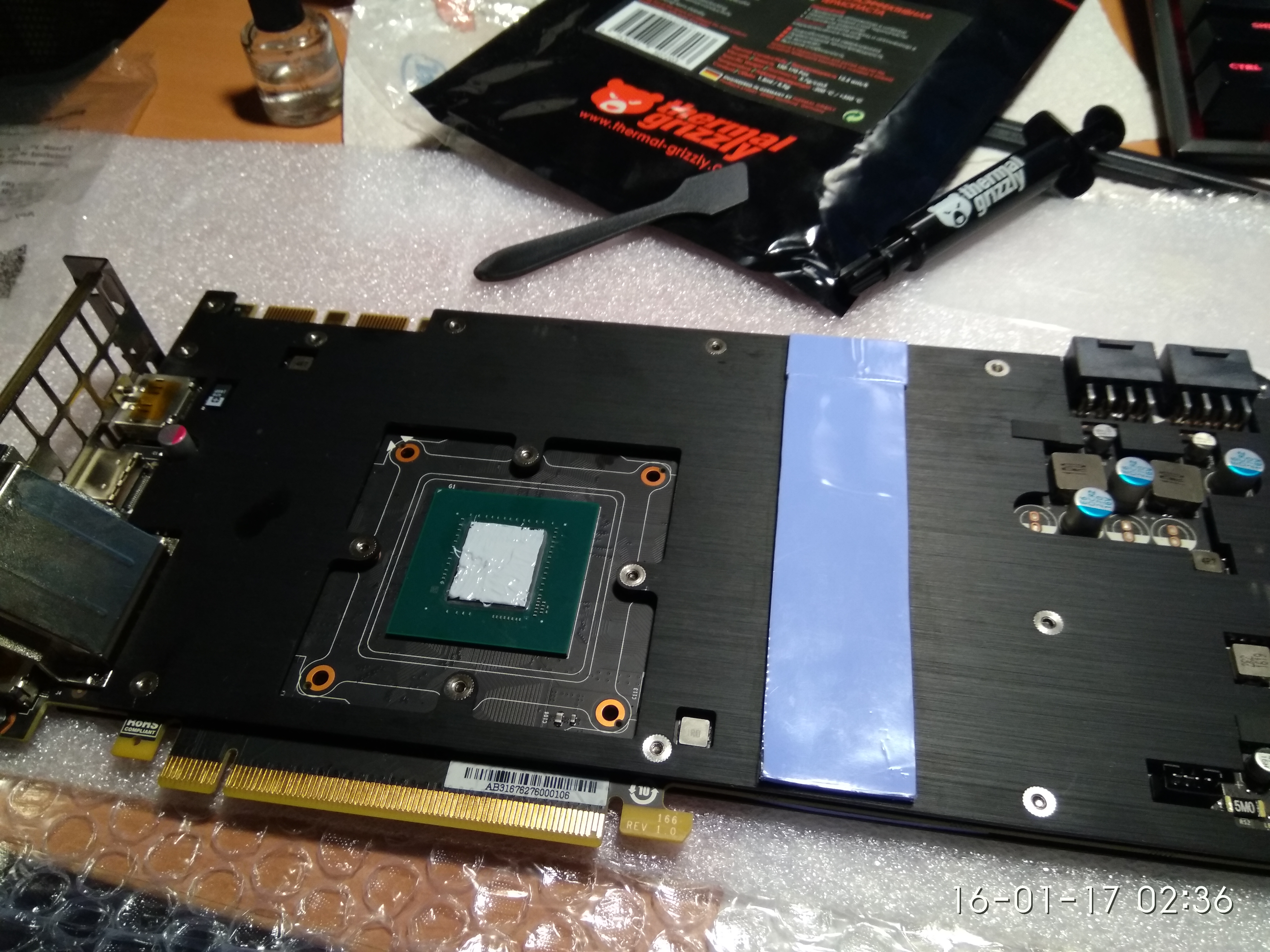 Алиэкспрессовский лист толщиной 2мм накроил так чтобы хватило на то что прописано в мануале от EVGA, а излишки уже в порядке отсебятины расположил опять же нам микросхемами памяти, но со стороны бекплейта. На ГП нанес Гризли Крионавт.
