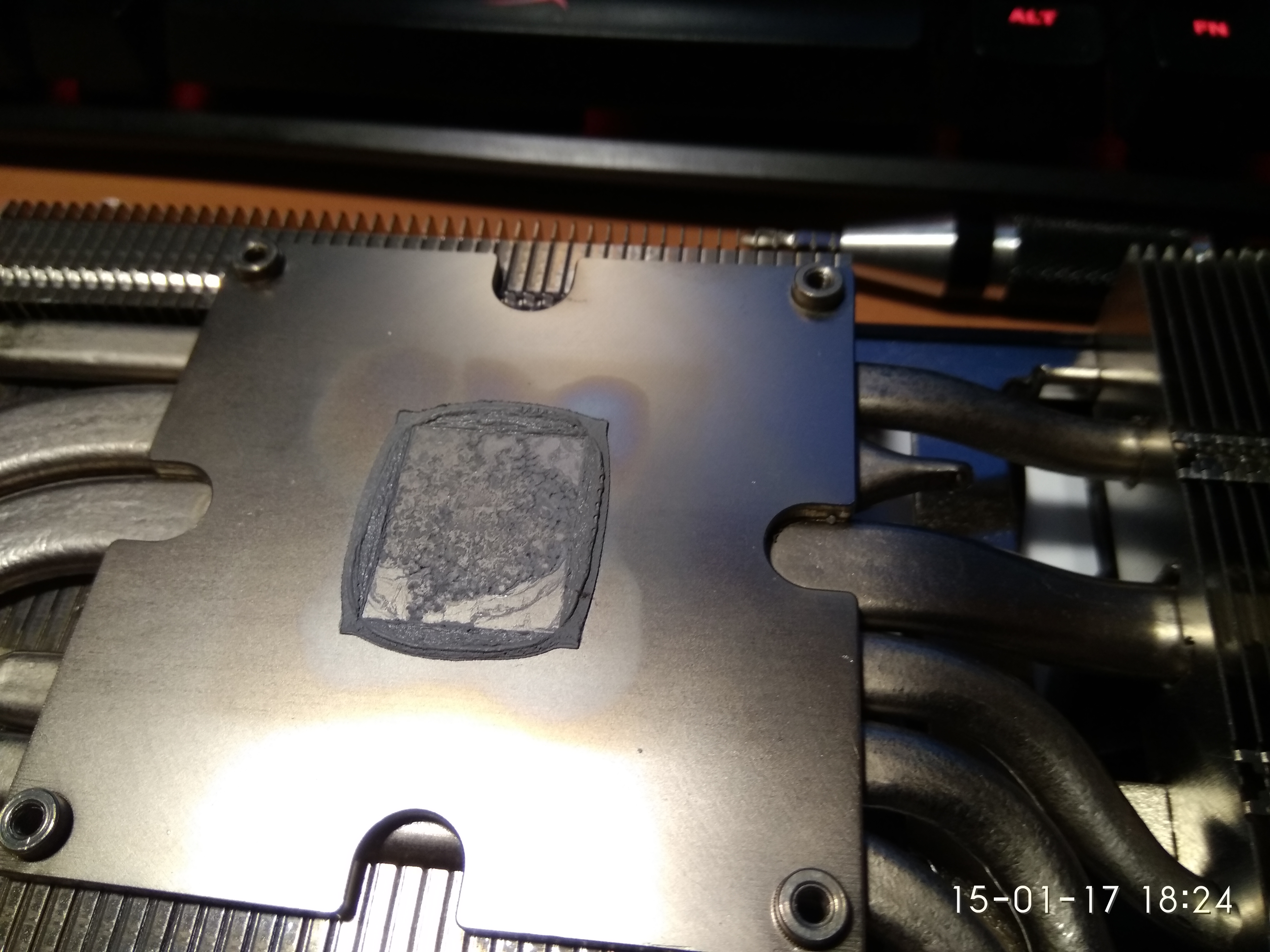Точно помню что до "вскрытия" в фурмарке всегда была температура 64-65 град. и даже такую температуру я считал очень низкой. Понятное дело что температуру ГП помог снизить Гризли Крионавт ну и сам факт обновления термопасты, но не на 20 град как при скальпе. Честно говоря, при вскрытии меня несколько смутил штатный термоинтерфейс. Он мне показался точь в точь как Интеловский под крышкой. На видеомануалах мне показалось что он там вроде даже тянется, на деле оказался очень плотным. На фото он кстати свежее и "влажнее" кажется. На деле я даже вначале подумал - не иссох ли? Попробовал пальцами - по пластичности прям один в один как был в Скайлейке при скальпировании.