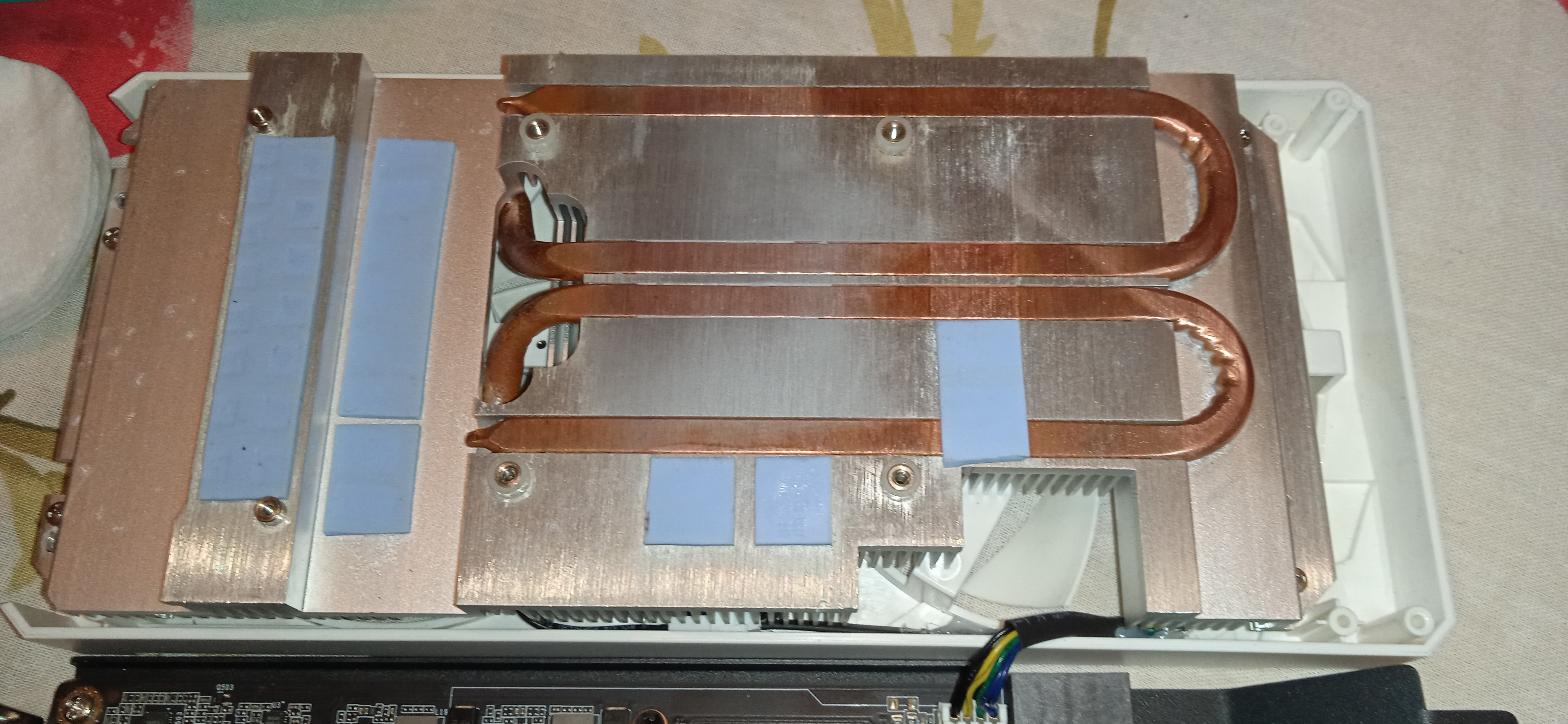 Выглядит красиво, но отличие большое конечно между этими сериями как мин. у меня охлаждения с завода на 1ю линии банок отсутствует, но это не суть, проковырялся 2 часа с заменой, первый раз собрал не понял почему не включается(сразу тухла) потом разобрал смотрю термуха с камня в общее не соприкасается с медной подошвой, посмотрел зазор между подошвой и банками памяти не ровная да же не знаю как описать, пришлось раскатал прокладки на памяти, ну, и по итогу получил этот результат в 80/104 по следу площадки прокладки вроде как соприкасаются все которые должны. Использовал Термопрокладка Thermalright Odyssey Thermal Pad Теплопроводность:12.8 Вт/мК Возникает вопрос, если смысл что то переклеивать или жить с 80/104 при загрузке в бубли можно? И вопрос на чипах какой размер 0,5 на фото не видно просто