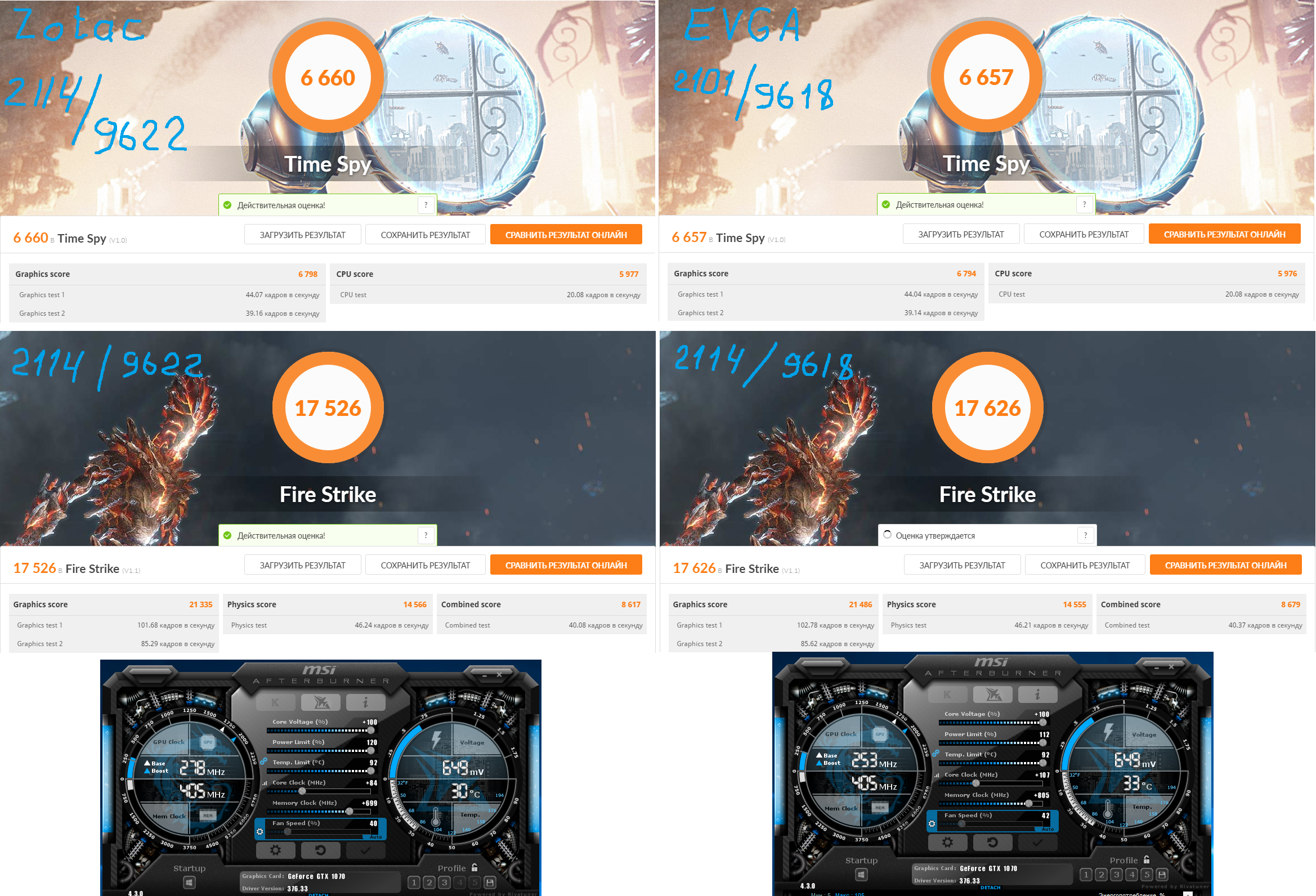 Решил посмотреть как поведут на моей EVGA 170 FTW биосы от известных топовых видеокарт. Заодно сравнил результаты в 3DMark и сравнил разгоняемость. Использовал биосы: 1. Palit GTX 1070 GameRock Premium - 86.04.3B.00.72 (Power limit 225w) 2. MSI GTX 1070 Gaming Z - 86.04.50.00.29 (Power limit 291w) 3. Zotac GTX 1070 AMP! Extreme - 86.04.50.00.98 (Power limit 300w) 4. EVGA GTX 1070 FTW - 86.04.50.00.72 (Power limit 208w) Прошивал из Windows утилитой NVFlash 5.328.0-win. Настраивал и мониторил с помощью MSI Afterburner. В 3Dmark гонял в 2-х бенчах: Time Spy и Fire Strike. Первая сводная картинка - прогоны при дефолтных настройках. В дефолте были следующие частоты в бусте: 1. Palit - 2063/8504 2. MSI - 2025/8100 3. Zotac - 2025/8208 4. EVGA - 2000/8014