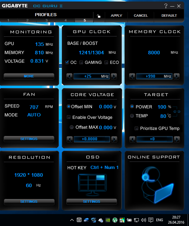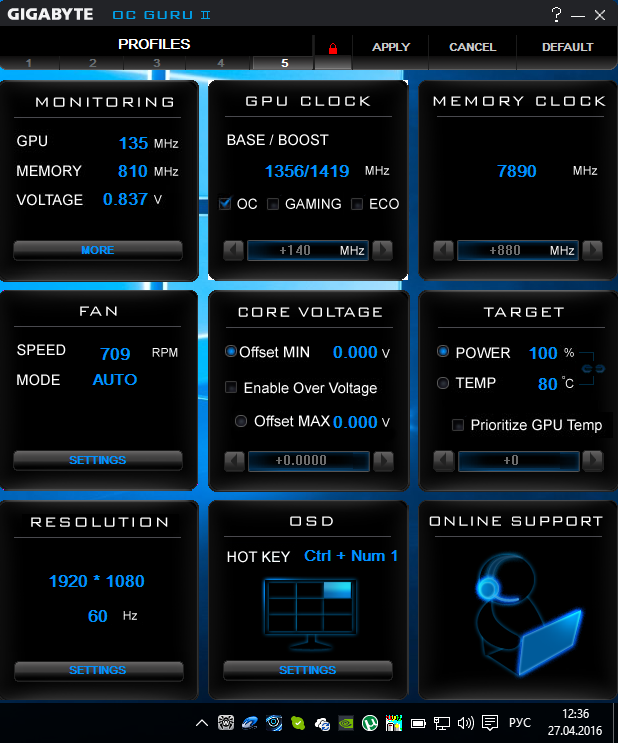 Andrew_tmb Сейчас еще попробывал. В итоге 1377МГц разгон, с бустом 1477МГц. Разгон +250МГц ядро, память + 300МГц тоже стабильно, но для лучшей стабильности остался на 2003(8012МГц память). По поводу температуры, пока выше 64 градусов не видел в играх. До этого тестировал стабильность карты Ведьмаком 3, но прошел ее и удалил. Теперь пока в Mad Max бегаю, тоже нестабильность быстро находит и греет тоже не слабо. #77 #77