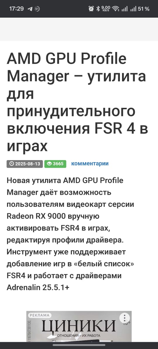 Реконструкцию лучей обещают в этом году прикрутить, amd redstone вроде называется. Еще вчера случайно наткнулся на тему нового софра амд для запуска фср 4 везде где есть фср 3 AMD GPU Profile manager. Сам не тестировал, но скрин на всякий случай сохранил. АМД трудятся над софтом, в них есть доверие. чего стоит их улучшения за последние года. Натянули интел и по немногу берется за зеленых)