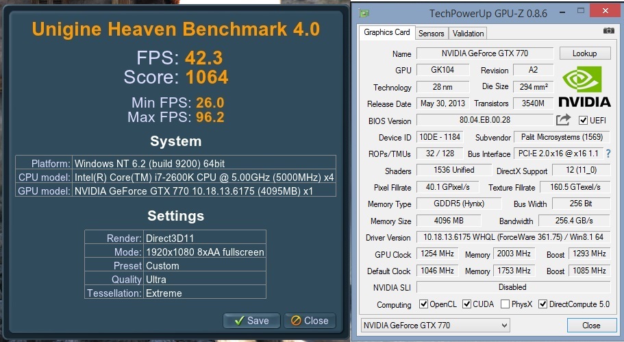 Я бы замерил, но карты уже нет, но разница уж точно будет больше чем на 960, память с 240 до 336 увеличила пропускную способность, а 960 со 110 до 120 Overclock[er] давай что-нибудь еще выложи, может я тоже на нее пересяду)) вот кстати Heaven Benchmark 4.0 на GTX770 1254|8000 #77