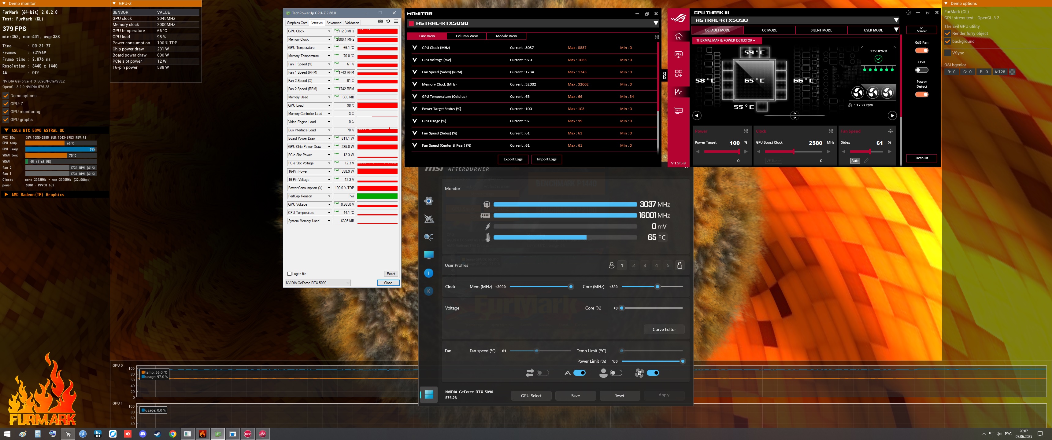 В общем послушал советов старожилов и купил ROG Astral GeForce RTX™ 5090, судя по форуму у меня в плане кремния чуть хуже, чем средний по палате, у Достопочтенных Джентльменов должно быть +3к память +500 чип? Мой рахит стабилен, дай бог, на +380 . Asus-ам конечно надо люлей раздать за такие поющие карточки, выбирал из 3 штук и все поют, выбрал на свой слух самую тихую, это не мой прошлый палит конечно, но тоже доставляет дискомфорт. Но, за что можно похвалить, это за охлад, тут вопросов нет: