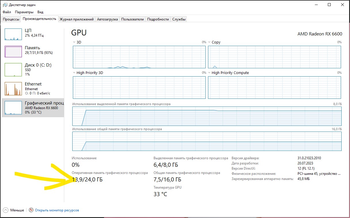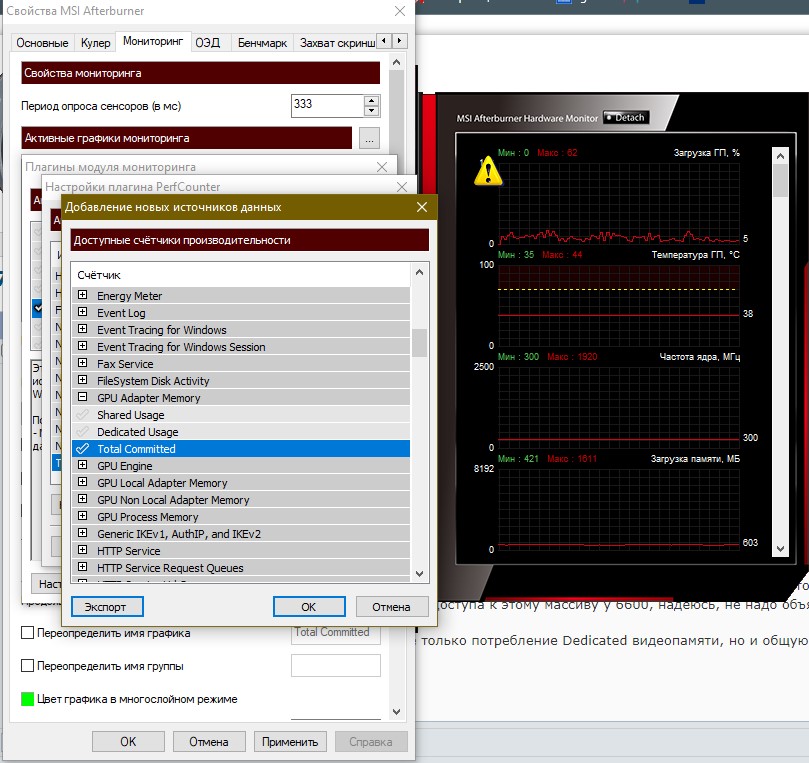 Синий Использование Видеопамяти, которая распаяна на видеокарте (в анг. версии называется Dedicated). Это именно то, что мониторится в Msi afterburner'e и именно то, что мы и подразумеваем под VRAM. Зеленый Общая память (в анг. версии Shared), которая начинает использоваться, при нехватки выделенной (т.е. Dedicated) памяти видеокарты. по дефолту разрешается использовать только половину от системной ОЗУ (та, которaя DDR4\DDR5 в материнскую плату воткнута). MSI afterburner ее не мониторит, но можно добавить через плагин Perfcounter.dll \\ видимо это ты и называешь "СВОПОМ". Оранжевый Это вся память графического процессора (Т.е. сумма предыдущих двух значений), именно это я и вывел ранее, ее называют Allocated. А теперь посмотри видео, которое я привел в пример ранее и найди знакомые слова, и ответь, причем тут загрузка видеопамяти игры? У него отдельно не мониторится загрузка видеопамяти в конкретной игре.