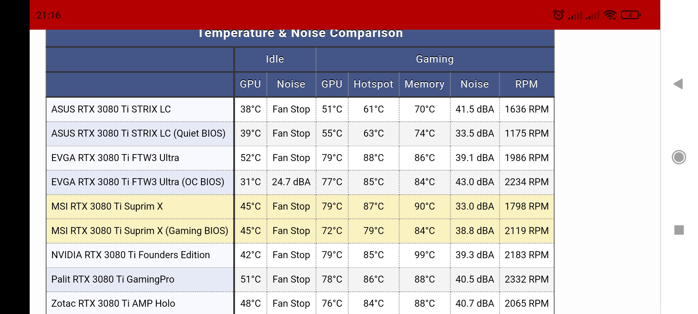 Сейчас смотрю сводную таблицу по уровню шума и температуре чипа в равных условиях и недоумеваю, почему evga ultra ставят в топ 3 , а более холодную и тихую suprim x нет? Вроде как по температуре чипа suprim x обходит тройку "лидеров" hof , evga ultra и strix или я не прав ? https://www.techpowerup.com/review/msi- ... -x/32.html