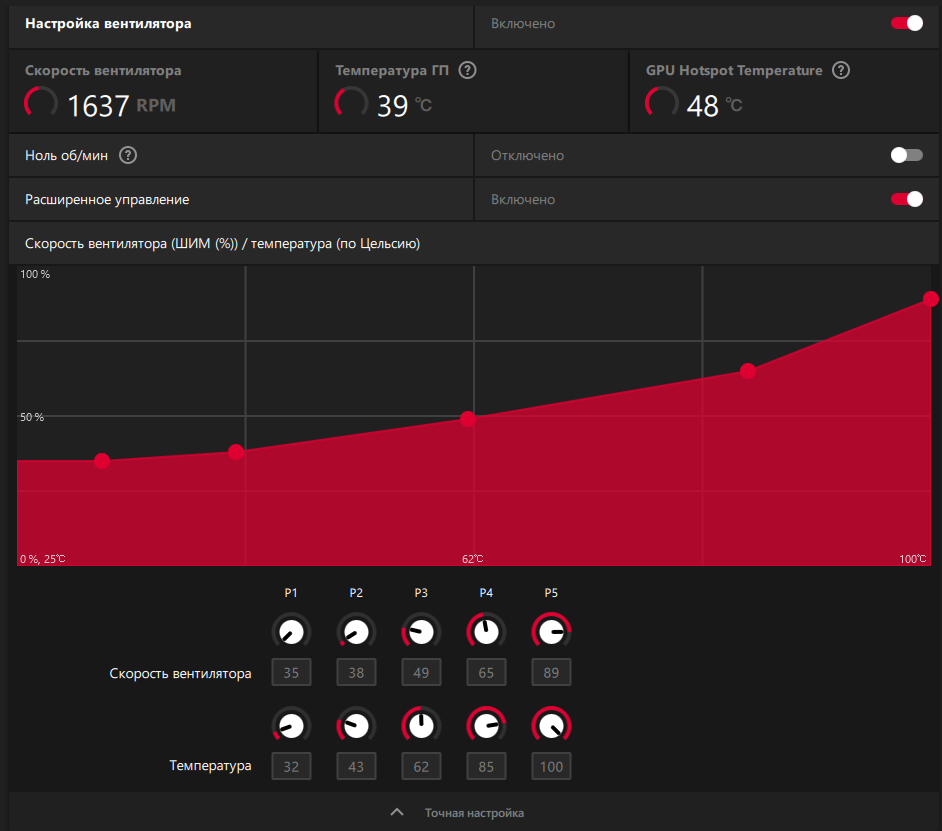 Я всегда настраиваю примерно так вентиляторы. Первая точка вентиляторы где-то процентов 30-40, так не тихо но достаточно чтобы при просмотре того же 4К ютуб видяха сильно не разогревалась. вторая точка это когда играешь в нетребовательные игры которые не сильно греют видюху. где-то до 65 градусов и процентов 50% вентиль, потом уже 70-75 градусов и где-то 60% вентиль, потом 75-80 градусов и 90градусов последняя точка. вентили настраиваю как правило на слух и по хот.споту.
