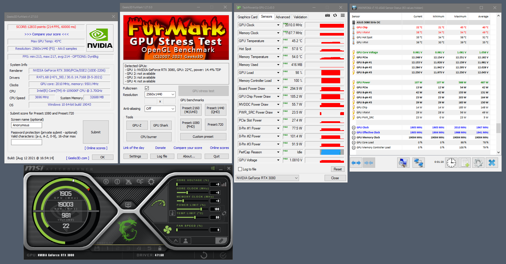 16.09.2020 - создание темы, добавление ссылок на обзоры RTX3080 17.09.2020 - обзоры Palit RTX 3080 GamigPro OC, MSI RTX 3080 Gaming X Trio, Asus TUF RTX 3080, Zotac RTX 3080 Trinity, информация по блокам питания 19.09.2020 - обзор Gigabyte RTX 3080 Eagle OC 10G, Nvidia RTX 3090 22.09.2020 - косметические правки, добавление ссылок 23.09.2020 - добавление базы данных с сайта overclock (спасибо coka) 24.09.2020 - добавление обзоров 3090 26.09.2020 - полезная информация по видеокартам Аmpere (алгоритм работы вентиляторов, причины проблемы с boost), и другое 30.09.2020 - дополнение к полезной информации, добавление обзоров RTX 3090, правки в оформлении 02.10.2020 - начато заполнение F.A.Q. 06.10.2020 - начат сбор статистики по видеокартам 08.10.2020 - добавлена информация по видеокартам Palit RTX 3080/3090 серии GamingPro и GameRock от Palit Support 09.10.2020 - в F.A.Q. добавлена информация по видеокартам Palit, поддержке VRR и прошивке BIOS. Косметические правки 10.10.2020 - добавлены ссылки на обзор архитектуры Ampere. В F.A.Q. добавлена информация по GPU Boost и лимитам. 29.10.2020 - добавлены обзоры на RTX 3070 от разных вендоров 31.10.2020 - информация по драйверам 04.10.2020 - в F.A.Q. добавлено пособие по работе с кривой MSI Afteburner 06.11.2020 - изменения в F.A.Q. по отличию видеокарт Palit 18.11.2020 - добавлена информация в F.A.Q. по BIOS от Palit и EVGA 20.11.2020 - дополнен F.A.Q. (достаточность RTX3000 для FHD/QHD/4K мониторов) 25.12.2020 - дополнена полезная информацию по картам 28.01.2021 - пример настройки курвы 03.02.2021 - обзор EVGA 3080 с андервольтингом 04.03.2021 - добавлена информация по замене термопрокладок на RTX 3080 31.03.2021 - добавлен BIOS с поддержкой Resizable BAR от Palit 05.08.2021 - добавлены обзоры 3080, 3080Ti, 3090 от occlub 12.02.2022 - добавлена информация по термопрокладкам 21.02.2032 - добавлена информация по термопрокладкам от T[]RK