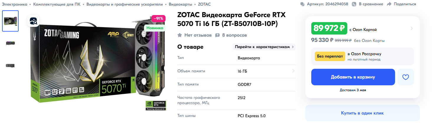 Happydreamerx так то да, но доставка 3 дня, явно не изза рубежа хотя у ситилинка тоже есть вариант Palit Видеокарта GeForce RTX 5070 Ti RTX5070Ti GAMINGPRO 16 ГБ за 89800