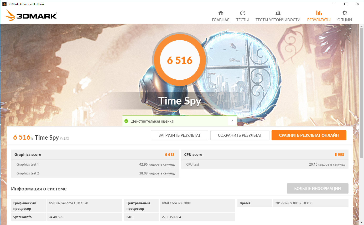 http://www.3dmark.com/3dm/17873053 Я так полагаю что в тесте Time Spy по сравнению с тем же Fire Strike - то, какой установлен центральный процессор и возможно оперативная память влияет больше. Я за барьер в 7000 в Time Spy так и не смог перевалить, сколько я не старался. Максимум что у меня получилось: 6657 при 2101/9618 или /9500, не помню точно http://www.3dmark.com/spy/1083999