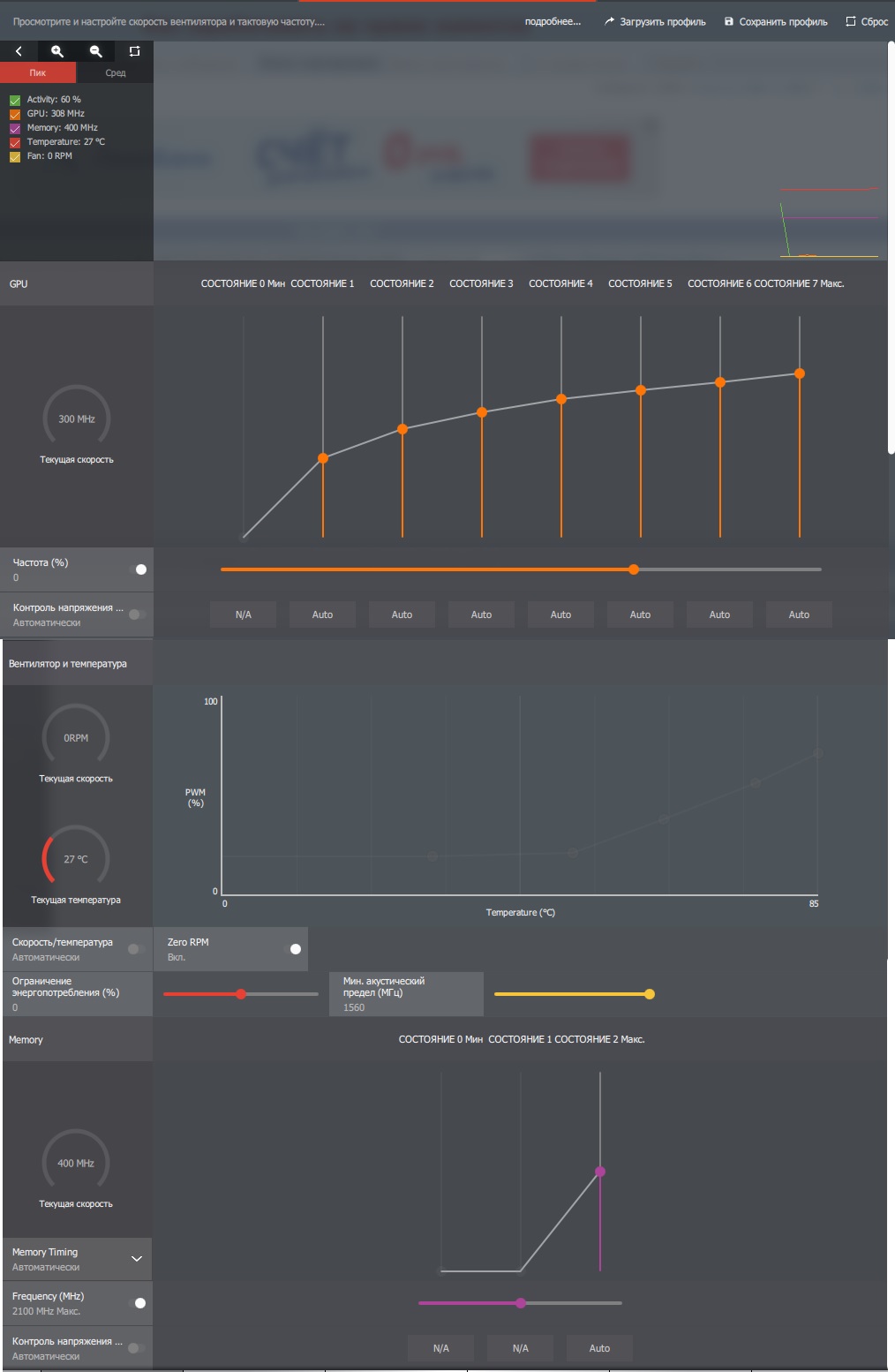 Q: Постоянно скачет частота памяти (или не снижается) в простое. A: При броузинге интернетов используется аппаратное ускорение - повышаются частоты чипа и памяти на некоторое время. Так же если у вас ДВА монитора, то частота памяти не будет снижается. Аналогичная ситуация для 144Гц мониторов.