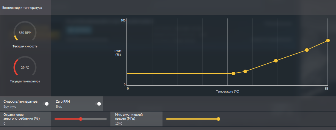 я не когда не разгонял и не прошивал , всегда работала на 45 ну и в играх сама включала винты да и сейчас включает с увеличением, только вчера поигрался с зеро рпм и на автомате она уже на 45 не стоит, медленно поднимается до 52гр и после начинает понижать винтами