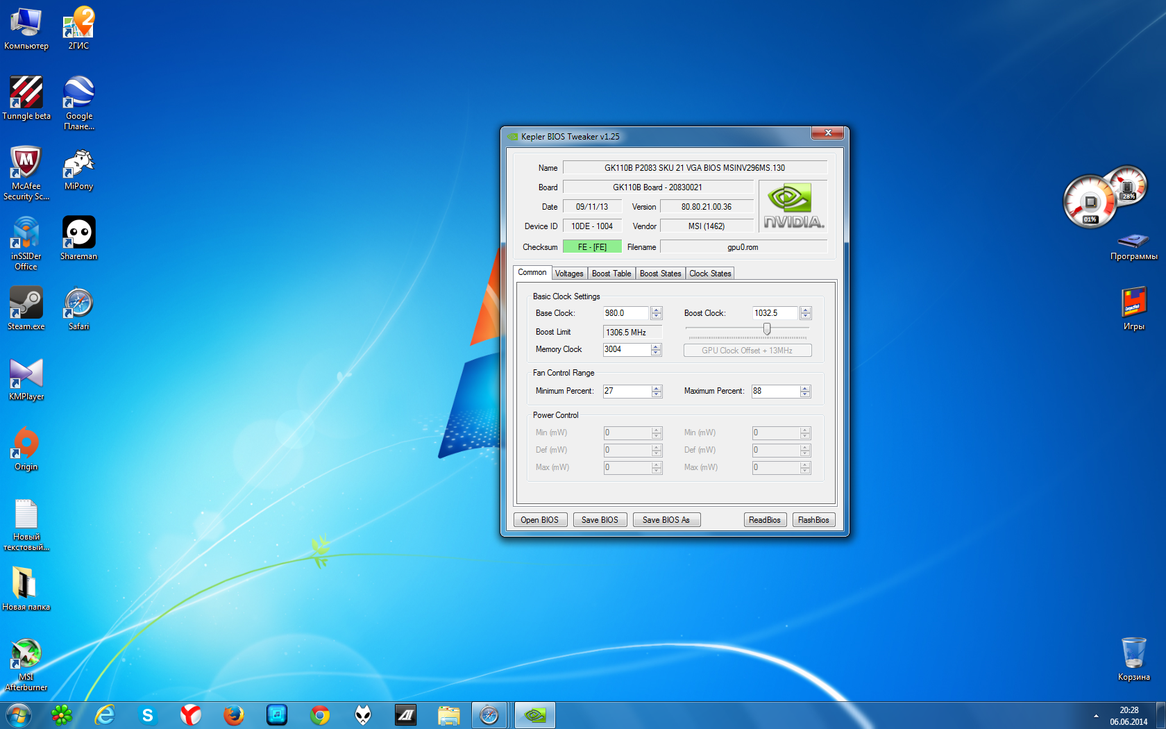 F@tality Да в Марке фигню показывает, нужно смотреть в прециссион или в афтебернере по графикам мониторинга. Кстати, в Кеплер биос 1.27 немного другая картинка. И у меня там показывает буст клок 1045,5. Но это совсем не мешает карте работать на частоте 1240-1260, иногда и 1280.