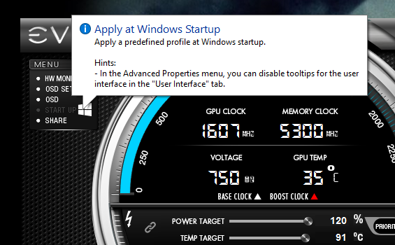в софте EVGA Precision не могу понять что делает кнопка Start Up. в опасании пишут apple predefined profile at windows start up. сначало думал это авто запуск софта Evga precison вместе с виндой, включил, но софт сам не запустился, до тех пор пока в General не поставил галку Start with OS