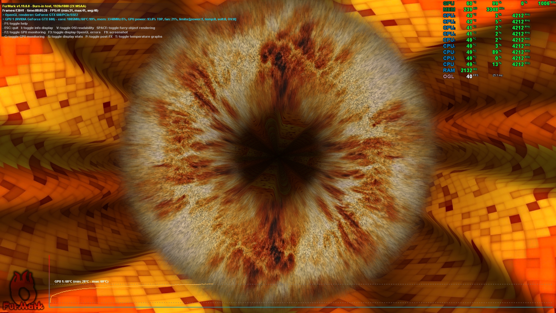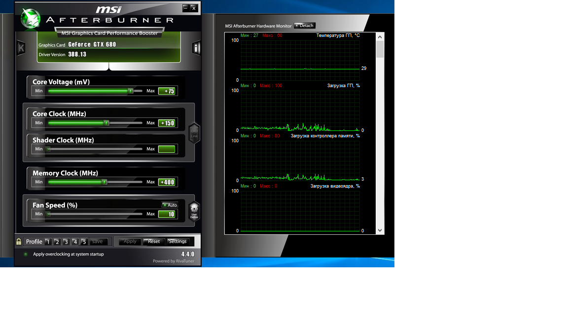 Парни всем ещё раз привет, давно тут не был, в общем у меня гтх680 на 4гб видеопамяти, в своё время, поняв, что гтх1060 мне не светит, я решил продлить максимальный срок жизни своей видимокарты путём замены системы охлаждения на более гораздо эффективную, итак моя стоковая гтх680 представляла собой ASUS GTX680 4GB DIRECT CU II, я не знаю в чём причина, но в моей версии радиатор имел 3 тепловые трубки вместо 5, и в играх со свежей термопастой типа залман стг-2 температура в игровой, а тем более в стресс тестовой нагрузке могла подниматься и выше 85градусов. И я приобрёл gelid icy vision rev.2, не возлагал особо надежд, но результат оказался фантастическим, даже в нагрузке бубликом этот охлад умудряется держать карту в пределах 60-61 градуса, стоит ли говорить, что в играх темпа не поднимается выше 58 а в иной ааа графонистой игре не выше 55, это пожалуй лучший результат на воздухе для предтопового горячего кеплера. К чему я всё это говорю - я решил разогнать карту по классике - мси афтербернером, взял стабильные +130мгц по ядру и +350 по памяти, разгон стабилен, температуры те же, ну может +2 градуса максимум, но дело в том, что играя с разгоном я решил взять по ядру +150, и вот - в играх идёт мёртвое зависание, исправляется лишь снятием задачи. Так вот вопрос, если я гоню, артефактов нет, температура гп не выше 62, и врм не выше 85 - может я делаю что то не так? Прилагаю скрины - один показывает температуру в фурмарке после 5 минут прогона, второй - скрин настроек мси афтербернера, с которыми игра виснет. Можно ли сдесь что либо сделать, что бы при взятии +150мгц по ядру комп не зависал в играх, зависает в смысле картинка мёртво висит и всё, артефактов и прочего нет.