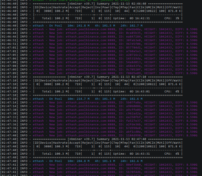 Auroson1c ...104-105 могут показывать некоторые майнеры, что есть фикция (особенно у NiceH) ...у 3080 средний хэш - 101-102, у меня он 101 из-за отсутствия встройки при чем, чем ниже темпа памяти, тем он ниже (хз почему), т.е. при темпе > ~48C - ~101, а при < ~48С - ~100.