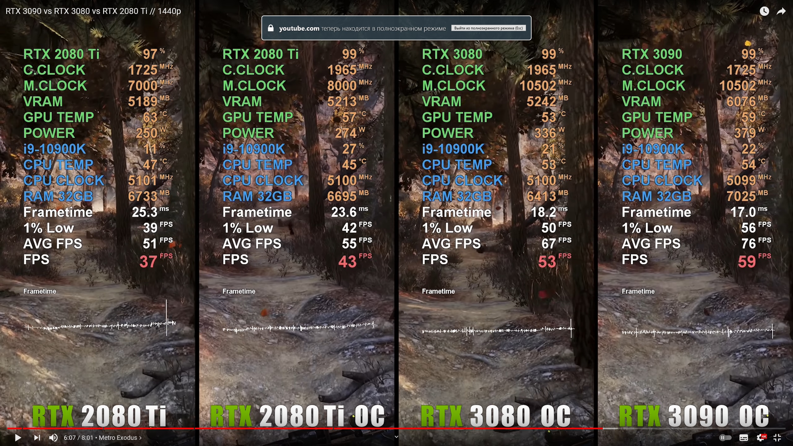Если Вы про Тайгу...То там у всех знатно проседает, с объёмом памяти не связано...Такие карты немощные, по цене авто На 3080 Ти ОС в 1440р(2560х1440) проседает до 53 примерно, местами... https://www.youtube.com/watch?v=WPTxkU38BKg объективный тест...Метро не помню, есть в нём или нет...Точно было про 2080 ти в ролике, сравнение с 3080 и 3090(Метро...Можете посмотреть на просадки)...вообще, ресурс правдоподобный.