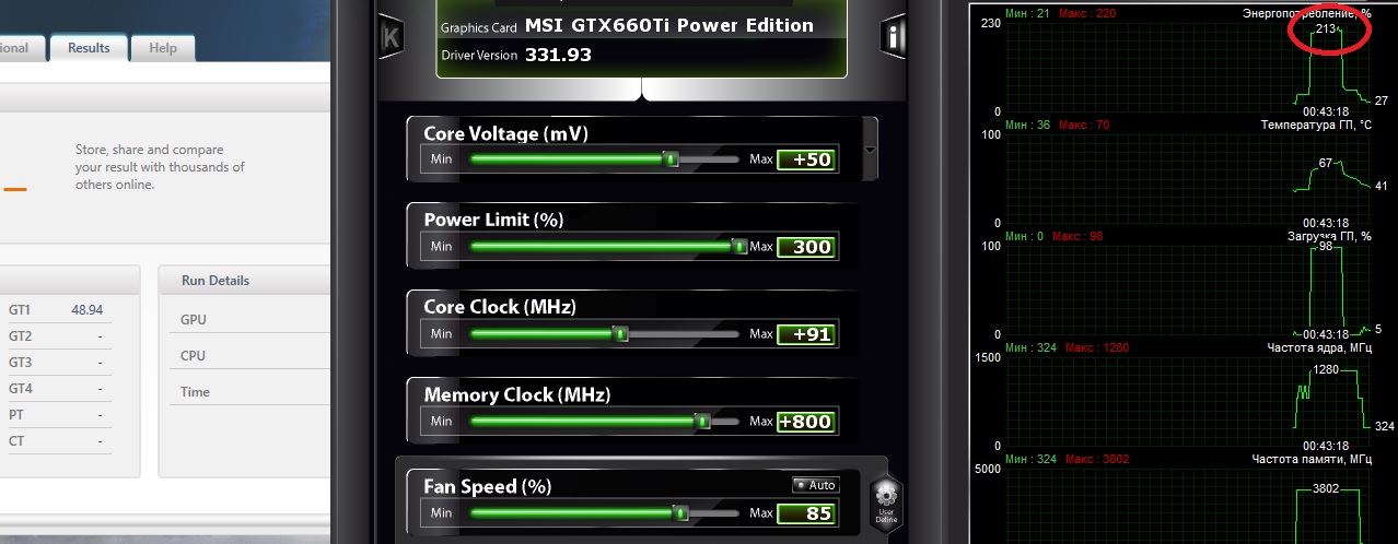 thunder_blade покопался поглубже в лимитах, поднял на линии PCI-E с 66W до 80W и особенно дало прирост когда я ползунки где 100W поднял до 110W общее потребление стало ~215W вместо ~176W температура поползла наверх, хотя напряжение не трогал