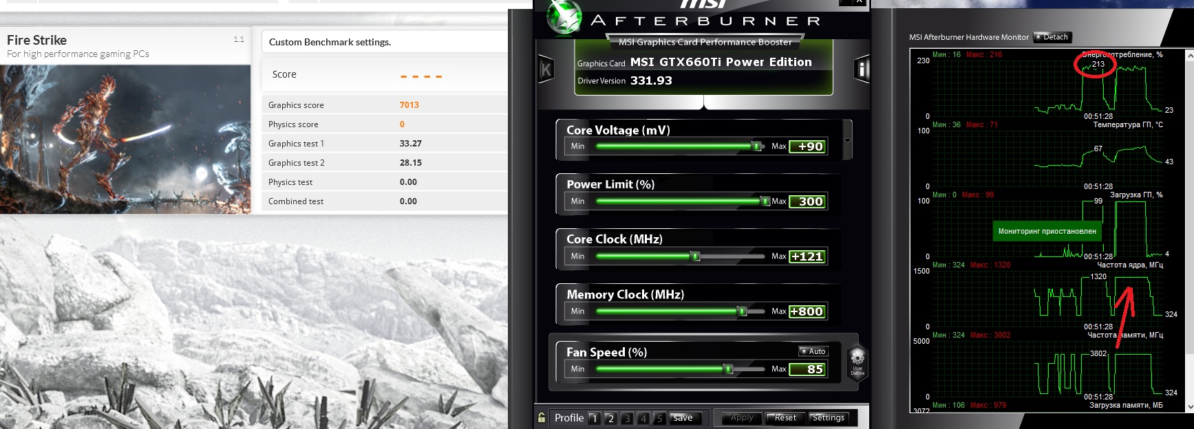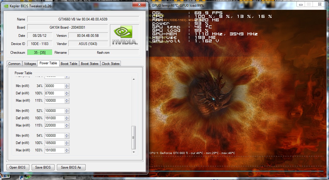 thunder_blade у тебя 53fps против моих 46fps в первом. у меня потребление показывает тоже в процентах, просто я за 100% взял 100W, поетому показывает 175% потребления возьми за Def 100W а за Max 250W, потом ползунок в MSI AB поставь на 250% и посмотри загрузку в процентах. значит у ASUS по другому с лимитами, или у них с завода просто больше дают превысить, или програмно можно менять, но почему тогда она больше 1300 у тебя не гонится с открытыми лимитами? или карта неудачная?