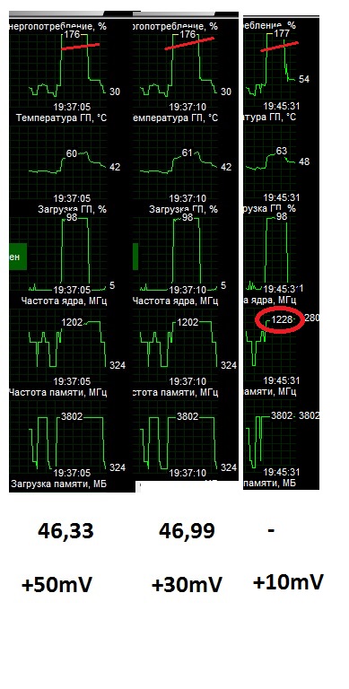 Понизил Core voltage (mV) до +30mV, запускаем, смотрим результат: та же частота 1202MHz но уже без просадок до 1189MHz. результат в кадрах: 46.33 на +50mV и 46.99 на +30mV