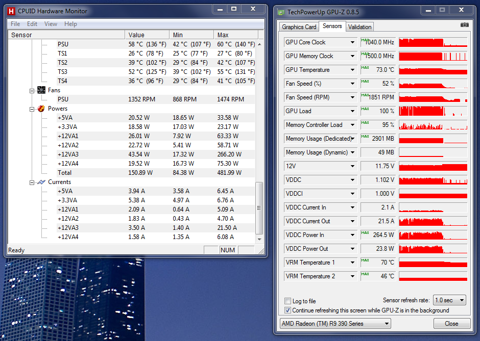 Ребят, а до каких напряжений гонять 390 безопасно? Разогнал немного свою 390 Saphire без поднятия напряжения нормально работает на 1100/1550 ( выше не пробовал еще). Напряжение с завода идет +13, в мониторинге вроде как 1.150 примерно( глянул сейчас, в афтебёнере кажет 1.25 макс было). И память гнать имеет смысл? А то на нее тоже вольтаж можно поднять) Температуры видел в ведьмаке до 68 градусов, что интересно на низких частотах ядра они были стабильно до 65 (все без поднятия напряжения).
