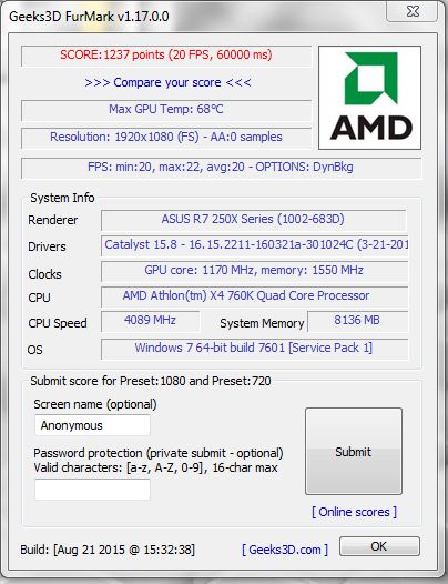 Это все ради разгона. Разве не для этого мы все сегодня собрались!) Прирост фпс имеется и при том зачастую ощутимый. В тяжелых графических режимах, таких как Witcher3 или Rome2totalwar дает прибавку около 5-7 фпс. Для меня разница между 24 и 30 кадрами имеет значение. Ща выбило серый экран с вертикальными полосами- перегрелось питалово. Теперь выставил 1160gpu/6400vram/1280mV. В том же тесте фурмарка набрало 1233 балла. Перегрева не очень боюсь, так как в стоковом биосе кривая куллера на грани адекватности. Куллер набирает обороты только после 65* и темпа дохдит до 84*. Приходится в VBE рисовать нормальную кривую. Так что в моем разгоне она получается еще холодней чем было бы в стоке