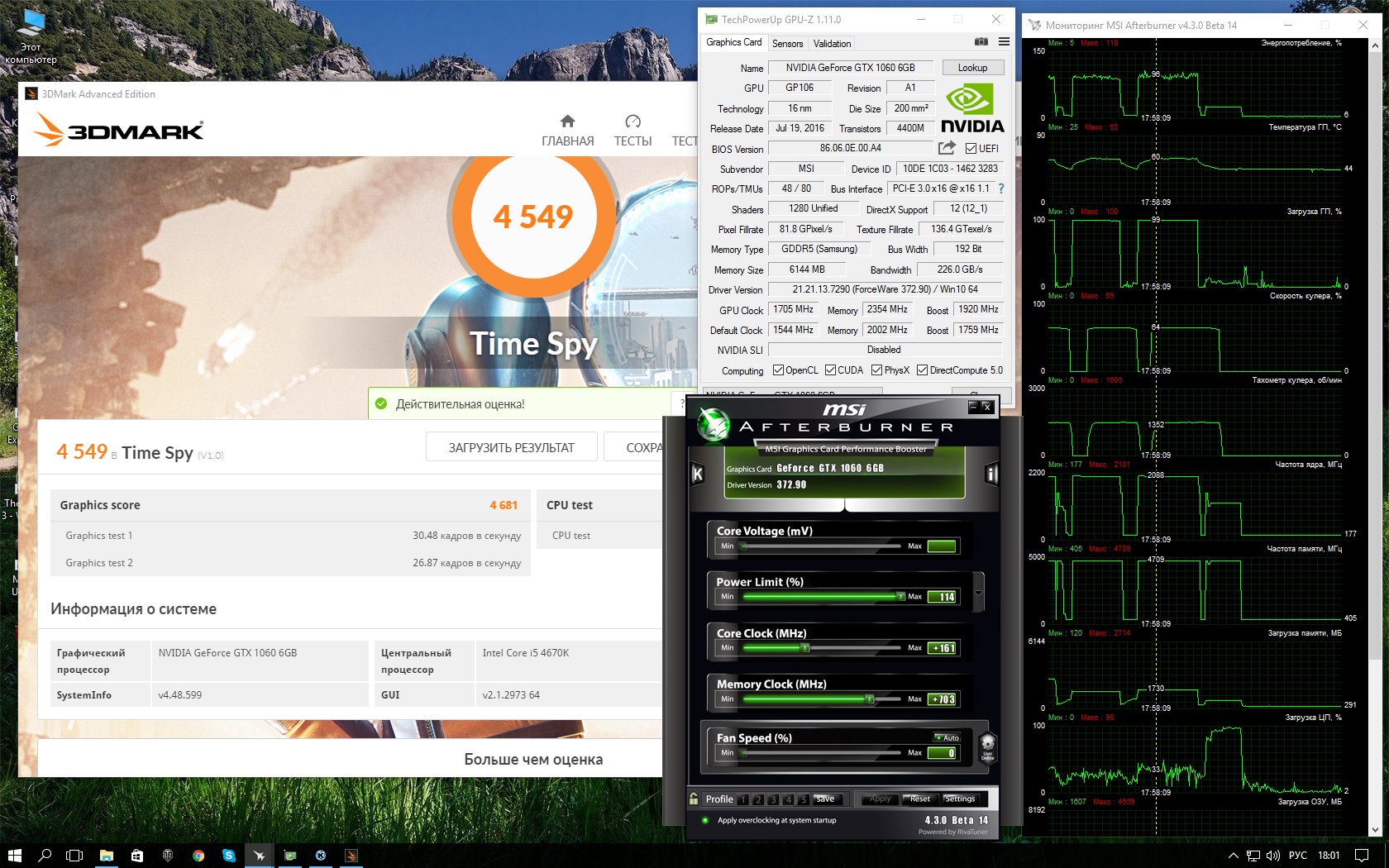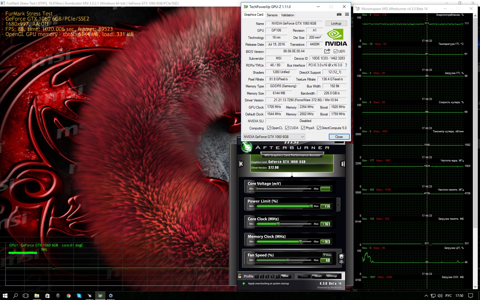Решил поделится результатами разгона MSI Armor OCV1, больше не пробовал, и карту жалко и более чем достаточно для 1060, по памяти артефактов нет, писк дросселей отсутствует. http://www.3dmark.com/3dm/15104655