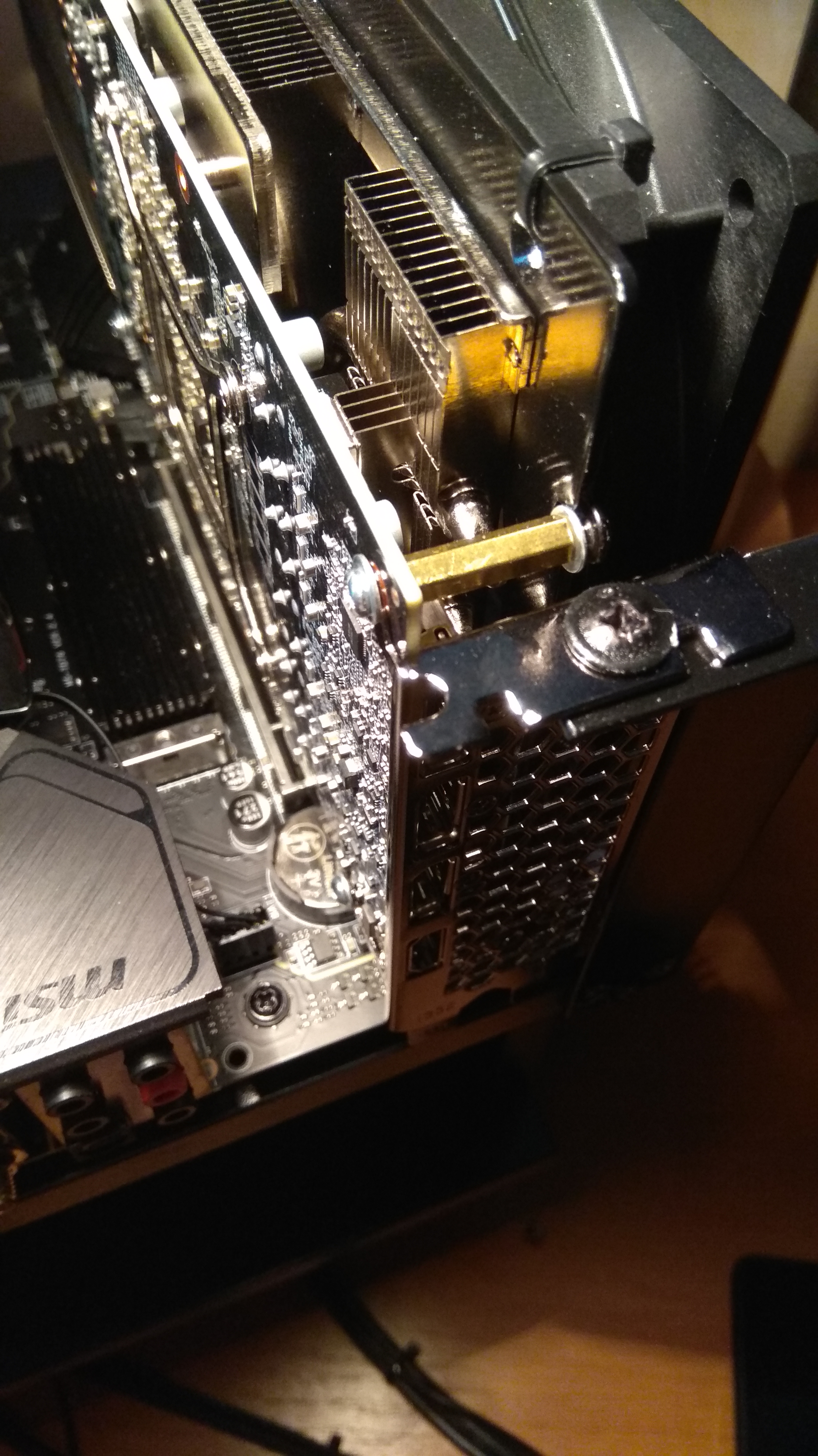 К плате через стойки крепится алюм. переходник, к нему вентили. В одном месте пришлось скобу вместо стойки колхозить, но в целом, когда покрасилось все получилось норм. Надо карту вынуть и пофоткать, чёт упустил момент. Напечатать такое/похожее из неск. частей имея принтер проблем вообще не вижу. Просто под 120-ки кожух городить бессмысленно, а вот для 3х92 надо репу чесать, если хочется красиво.
