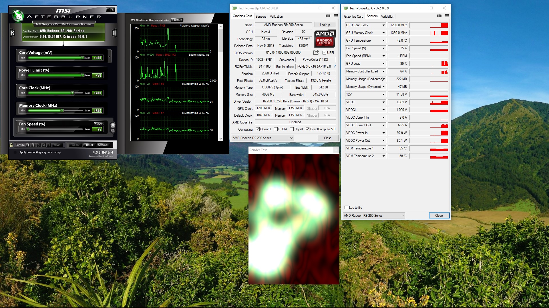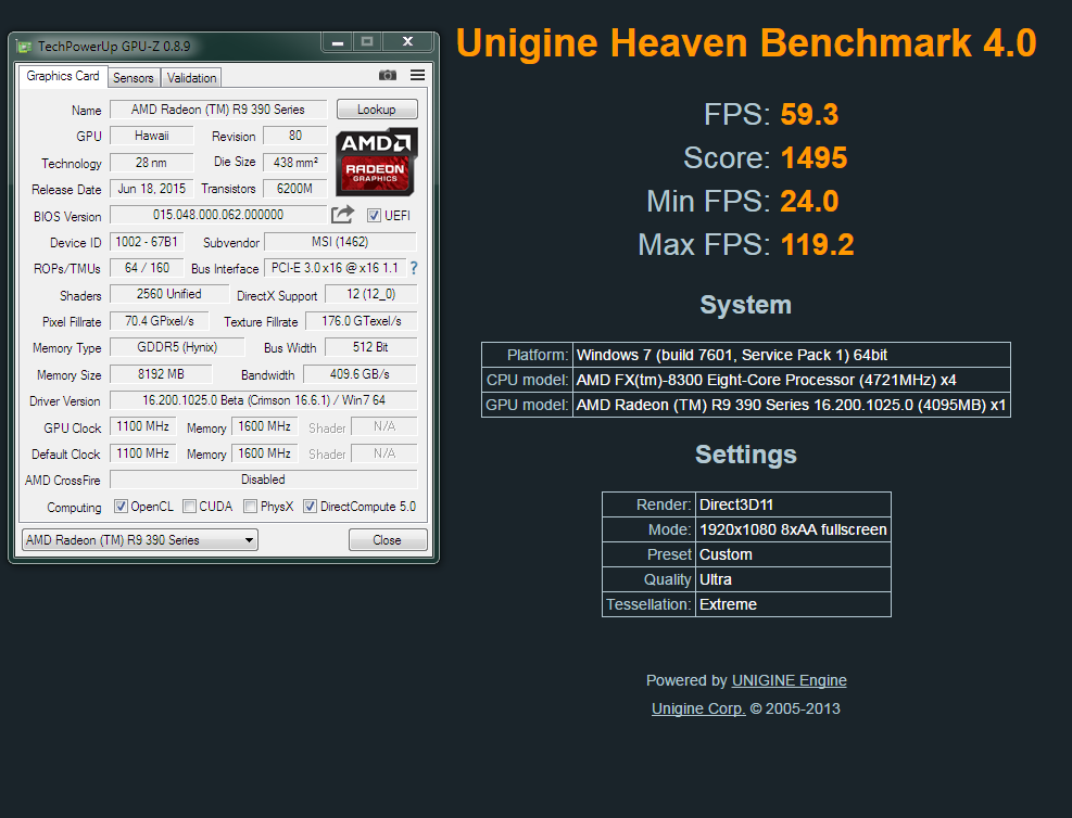 1250Мгц держит в хевене, а вот 1300Мгц уже нет. Хотя температура от поднятия +100Мгц выросла всего на пару градусов.