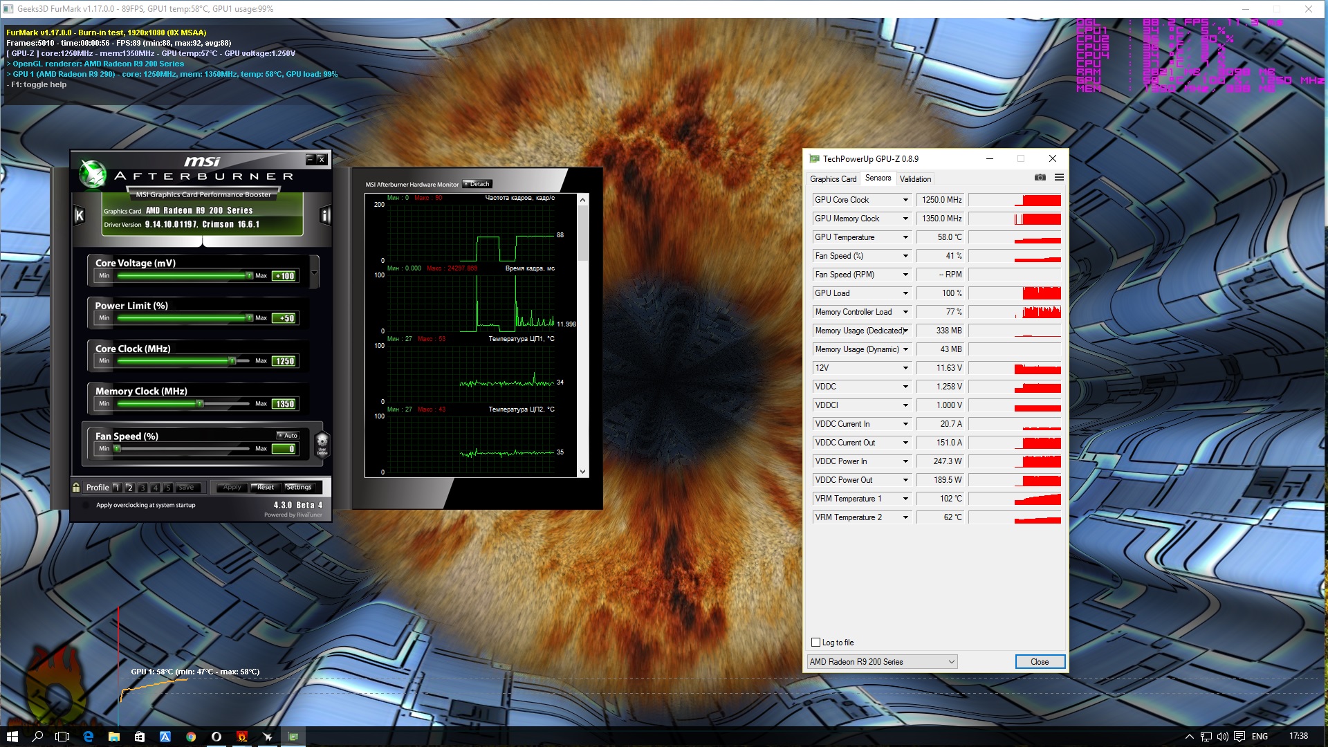 VRM1 нагрелся до 102 градусов пора завязывать с экспериментами. 1250 Мгц по ядру на воде может, большего и не надо