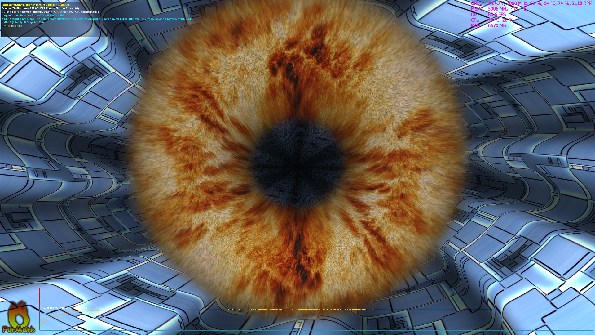 Фурмарк из коробки проходил где-то до 70-75 град по ГП. Температуры в зоне VRM - сложно сказать, без пирометра не определишь, но думаю в пределах нормы (80-90 гр) Сейчас ГП в Фурмарке уже 65 гр.