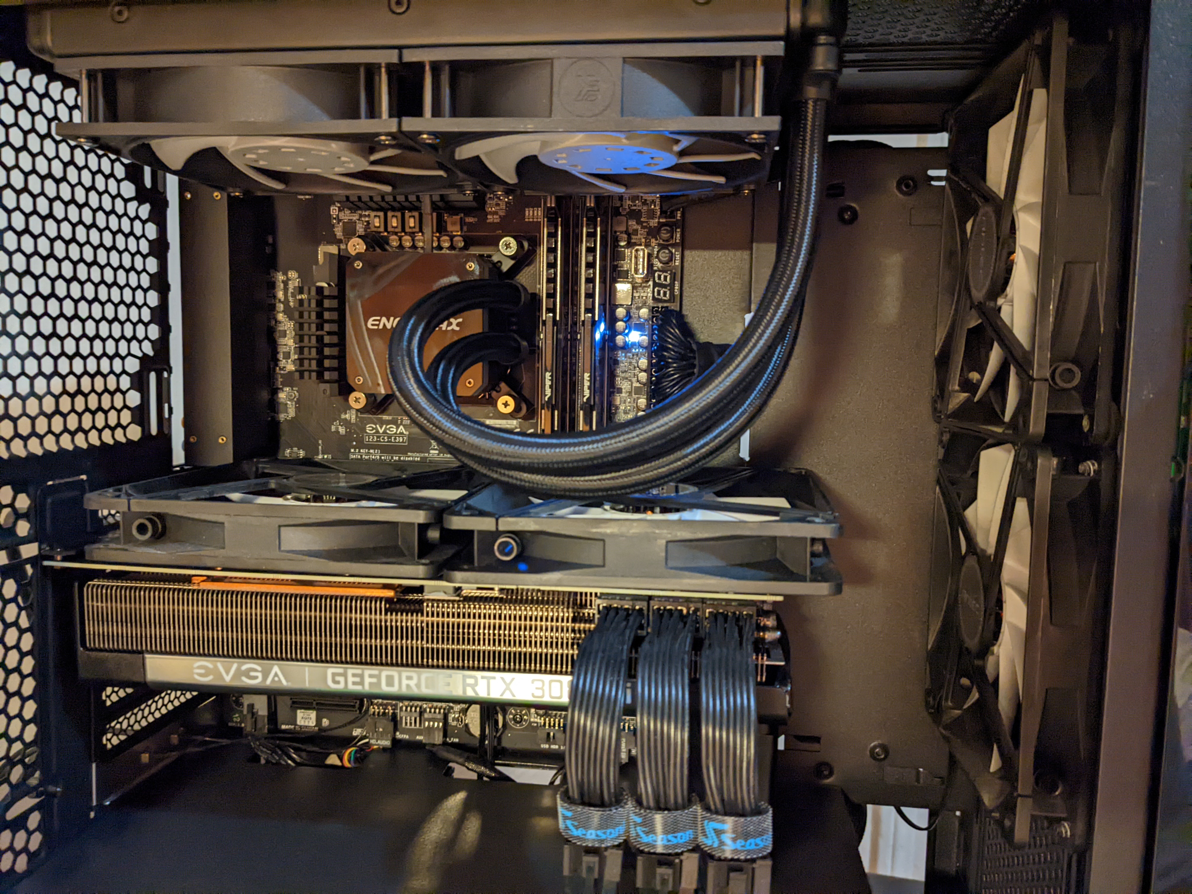 Наконец собрался с мыслями и сделал этот примитивный мод, многими поставленный под сомнение в плане эффективности. Речь идёт об установке термопрокладок под бэкплейт EVGA 3080Ti FTW3. В стоке это не более чем декоративная накладка, никак не контактирующая с тыльной стороной платы. Многочисленные отверстия в форме сот способствуют естественной конвекции. Если накинуть поверх 120-140мм вентиль, можно получить незначительное улучшение температуры памяти/гп, крайне несущественное. Однако, сама пластина греется в нагрузке весьма ощутимо, даже в отсутствие прямого контакта с текстолитом. Против затеи о размещении термопрокладок под бэкплейт стояло мнение о том, что площадь контакта будет существенно меньше возможной как раз по причине наличия множественных отверстий. Тем не менее, в рамках эксперимента был приобретен комплект 3.0мм Gelid GP-Ultimate. Двух пластин размером 90*50 оказалось более чем достаточно. Плюс небольшой колхоз в виде пару 140мм/750rpm поверх, на выдув. И получился неожиданно крутой дроп по температурам, причем по большей части ГП, чем память. Около 8 градусов по чипу, минус 6 по памяти, Киберпанк стал играться до 62 градусов в 4К на Макс настройках, dlss-quality.. Память -78 против бывших 84. В общем,смело могу рекомендовать владельцам FTW .