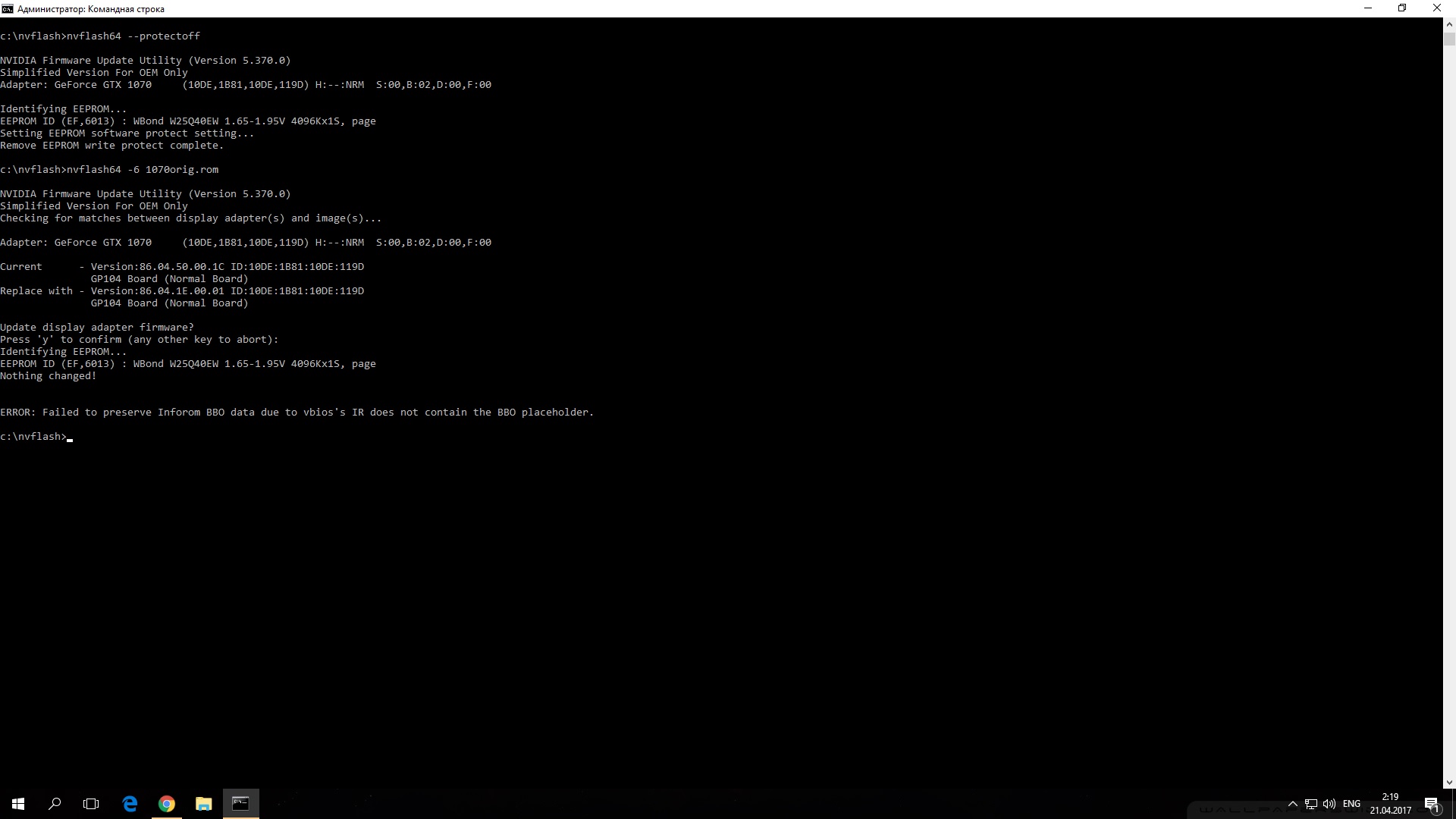 Ребята, помогите советом. ВК Inno3d 1070 twin x2. Прошивал новый биос утилитой Inno3d TuneIT, захотел вернуться на старый (оч нужно) - не захотел ставиться. Попробовал через NVFlash по гайду: тоже не получается. Какая-то нетипичная ошибка незагугливаемая (см. предпоследнюю строку). P.S. отключать вк в диспетчере устройств перед всеми процедурами также пробовал.