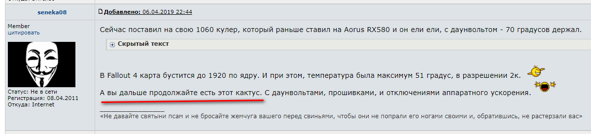 Я вот не понимаю товарища, который тут сидит и поливает RX-сы. Если у других карта нормально работает, в отличии от вас, то накой ляд тут устраивать срач и споры? Поменял на другую, стало лучше - молодец. А у кого работает нормально - им и так комфортно будет сидеть. Смысл тут что-то кому-то доказывать. В моем случае, к примеру, имеется 590 от сапфира. На ней и без даунвольта нормально все по температурам. Выше 50% обороты не ставил даже при предельном разгоне с поднятием напряжения. Обычная рабочая температура в играх (в зависимости от нагрузки) от 50 до 65 градусов.