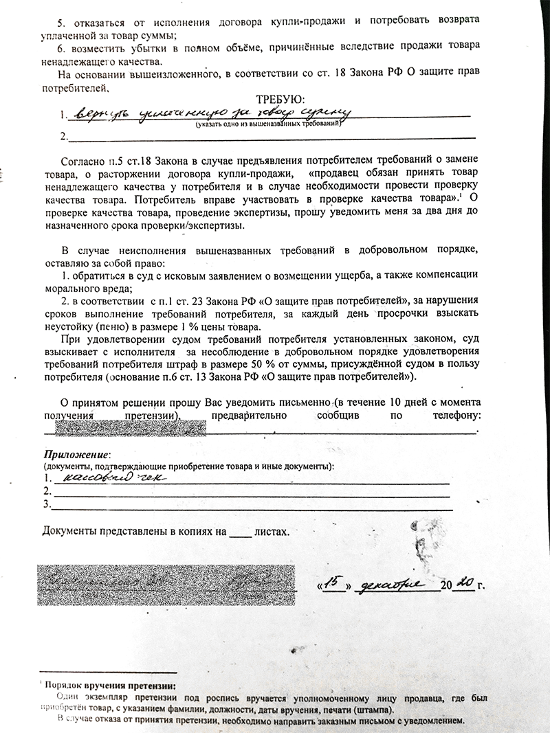 Только заявление с конкретными требованиями магазины обычно предлагают написать уже после проверки качества.