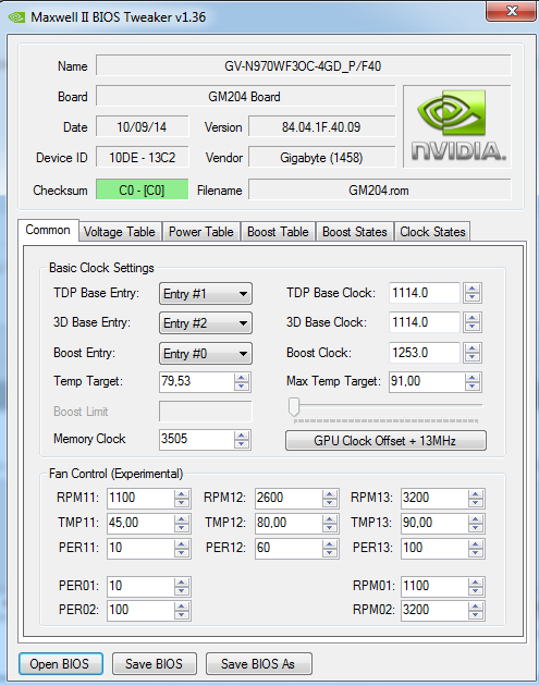 Информация от участника темы: Аффторитет Приведу пример как разгонять карты 970/980/980ti по таблице буст частот. Не буду писать как бекапить/сохранять биос, как и какие ставить поверлимиты - все это есть в шапке темы в инструкции по разгону. Образцом к материалу будет моя MSI GTX970 gamming 100ME. Поиграл я с разгоном в Afterburner-e и решил зашить разгон в биос. Задача разогнать карту бустом до 1506МГц при напруге в 1.231в. Начинаем.