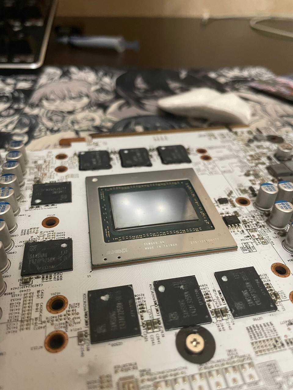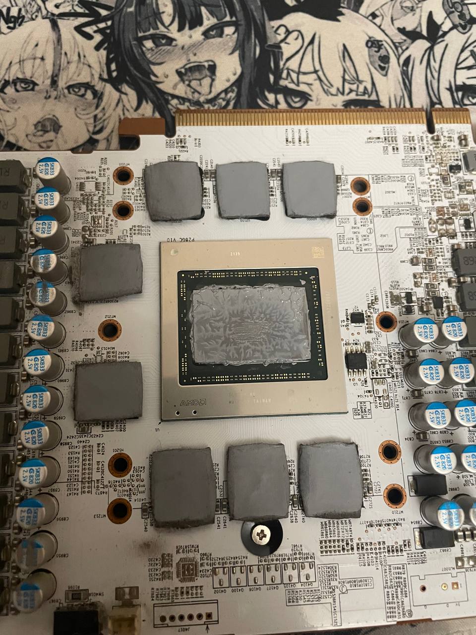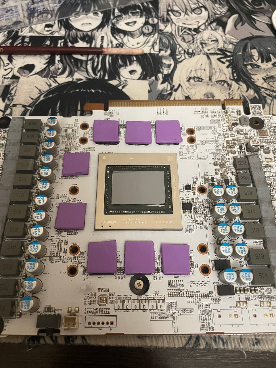 Далее использовал термопрокладки от фростмайнинг на 1.5мм и фазовый переход от Honeywell. Не стал по бокам ничего менять из тех мизерных термопрокладок, на вид и ощуп еще нормальные, да и материала бы не хватило у меня на них..