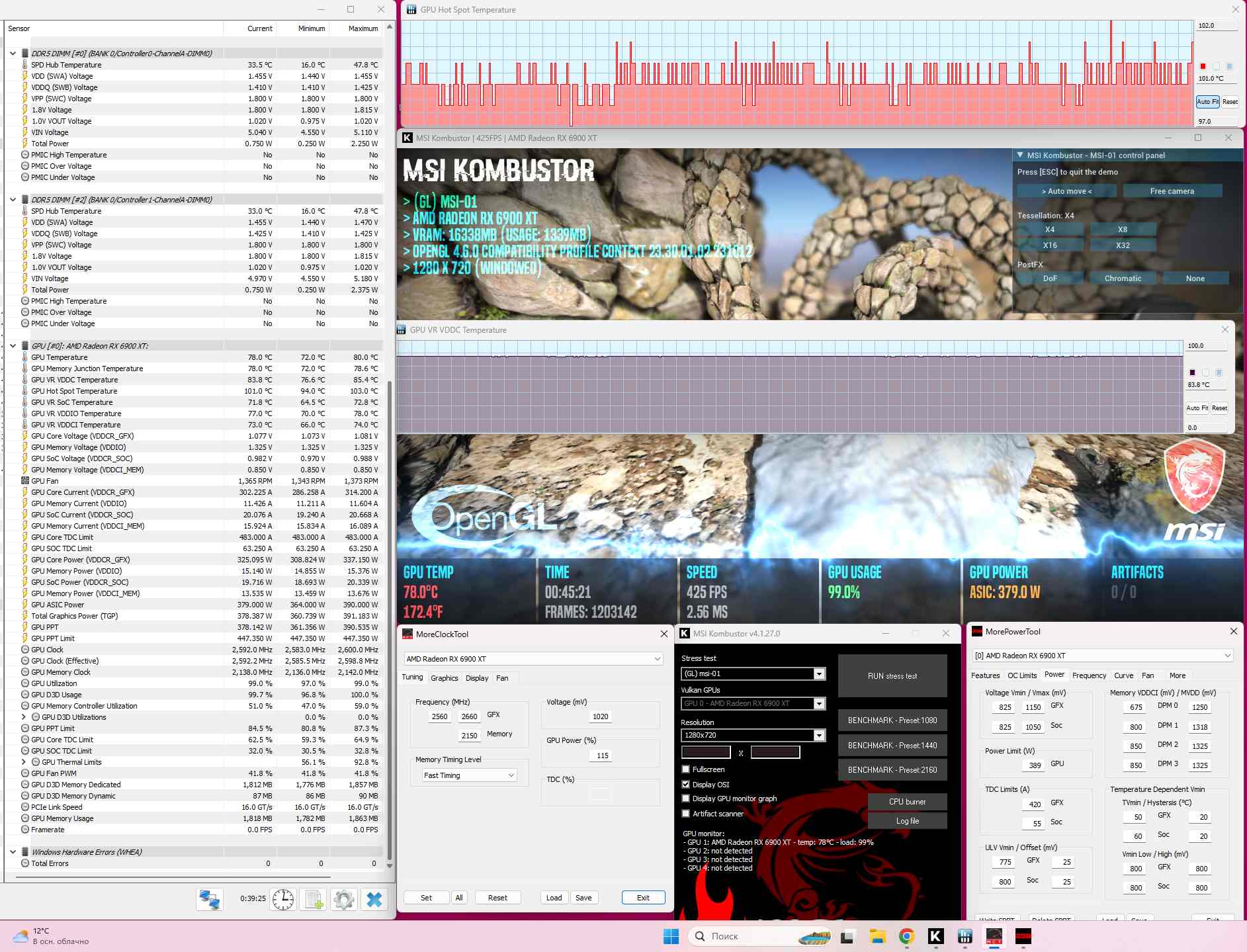 Что по температурам? А хрен его пока знает! По дефолту карта могла уйти на сток.напряжении 1150 мВ в хот спот под 110 градусов, сейчас в 4К разрешении тестирую и не вижу больше 92 (это пока самый максимум, в среднем держит ниже 90) (Да, да, результат пока так себе), но мне сказали подождать несколько дней пока фазовый переход начнет себя показывать, а там гляну уже окончательно. В любом случае я НЕ сижу на сток напряжении и карта вполне одолевает барьер в 1050 мВ при частоте 2484 Мгц. У карты к слову PPT дефолтный ограничен на 272 ватта.