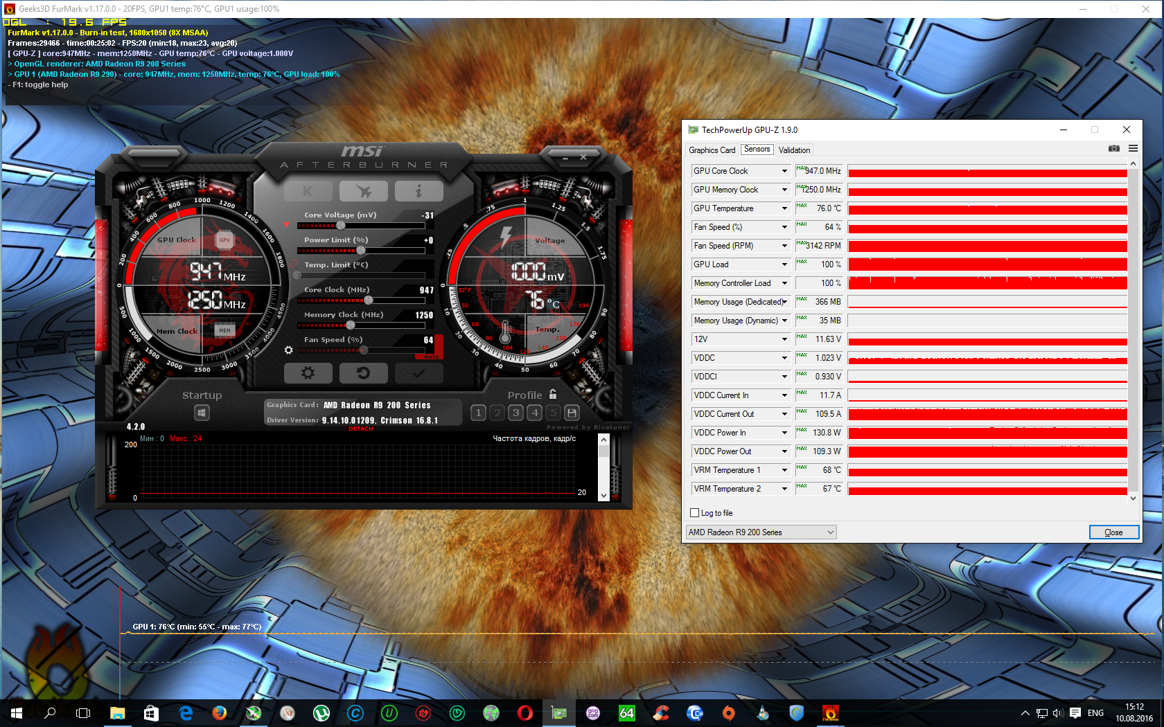 Там сначала и тестил, прогонял чуть ранее на 1000 1500, темпы до 90 доходили за 5 минут, VRM тоже почти до 90, но ошибок никаких не было. Потом уже по старинке перешел на фурмарк от греха подальше К слову, если б не ведьмак, можно было бы еще -30мВ сделать, но он единственный при таком напряжении артефачит, при том что даже бенч Метро стабилен. Кстати, все таки разузнал, что допустимая рабочая температура для VRM на Hawaii картах до 120 градусов, а "в пределах 60" это только на воде