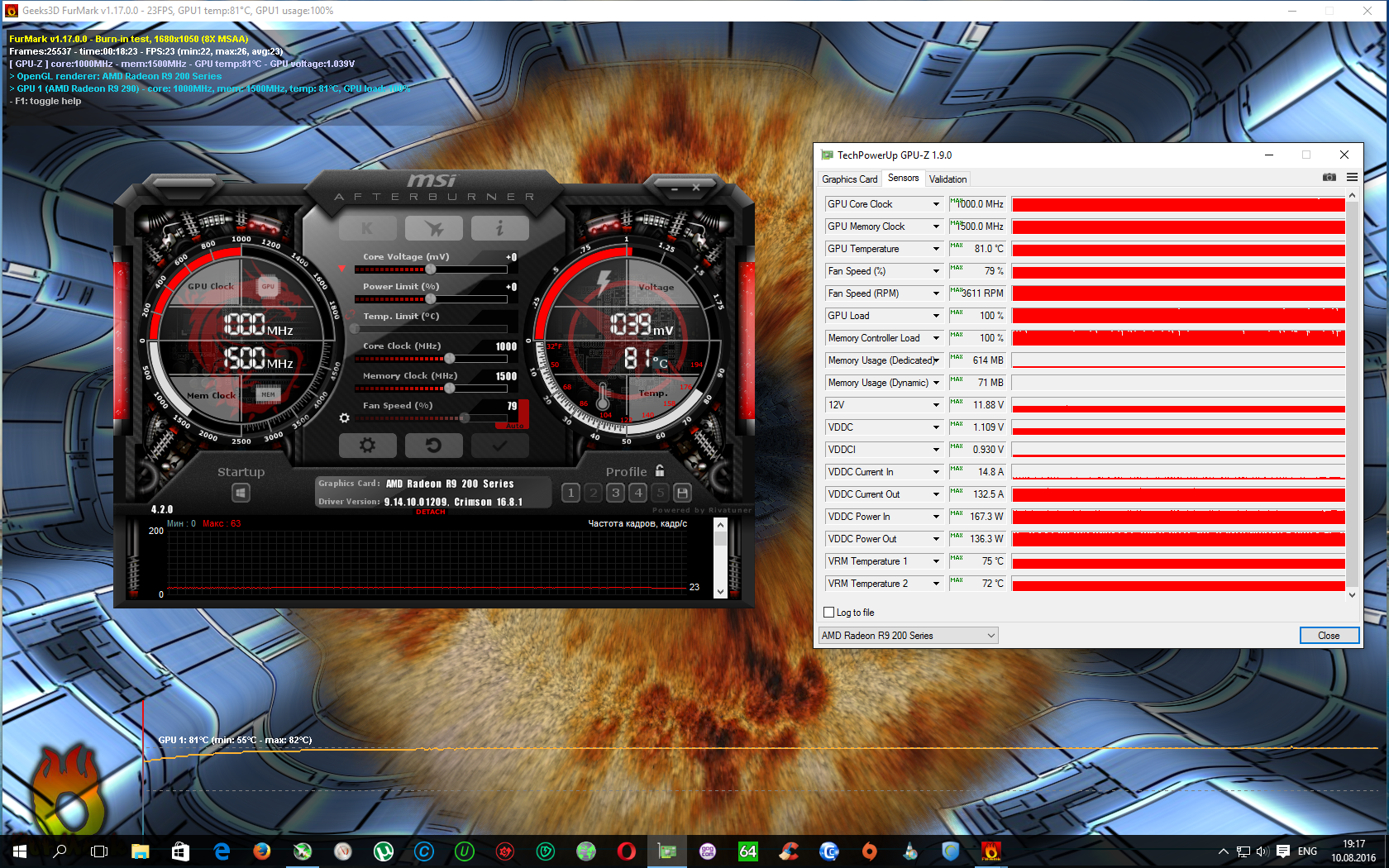 выигрыш в температурах просто не может не радовать. Даже с временной дешевой термопастой и при комнатной температуре 33 градуса. Ранее прогревался чип до 84-85. Но я так понял, что в основном все стараются охладить не столько чип, сколько VRM? Прогнал немного в фурмарке на стоках сначала от 290:
